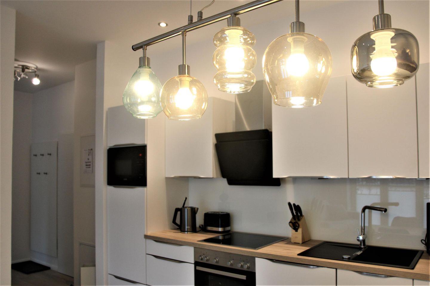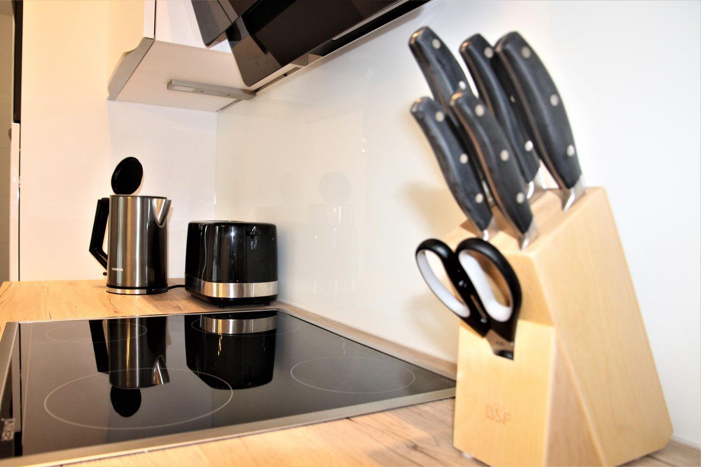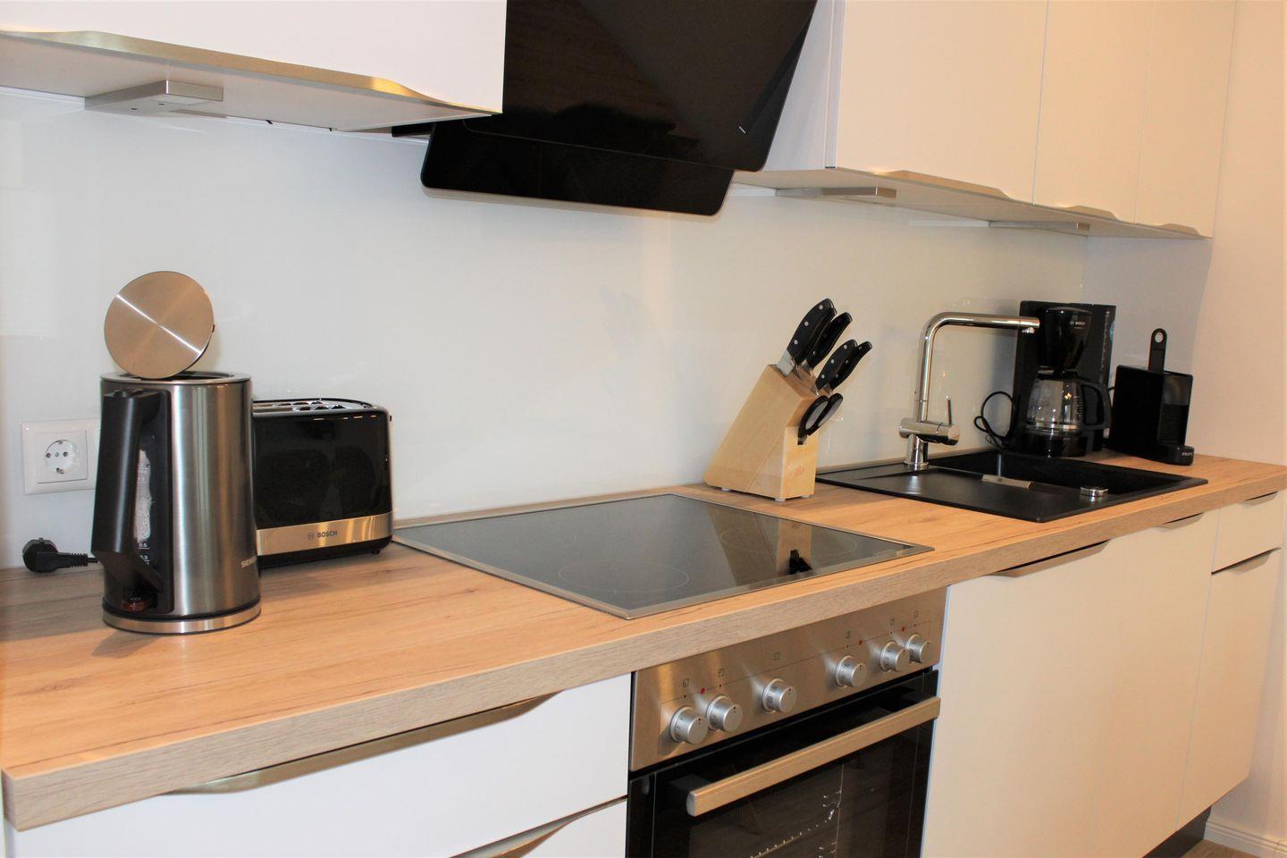 Küche: Einbauküche, Kühlschrank mit Gefrierfach, 4-Zonen Cerankochfeld, Backofen, Dunstabzugshaube, Geschirrspüler, Kaffeefiltermaschine, Kapselmaschine, Toaster, Wasserkocher, hochwertiges Geschirr und Besteck