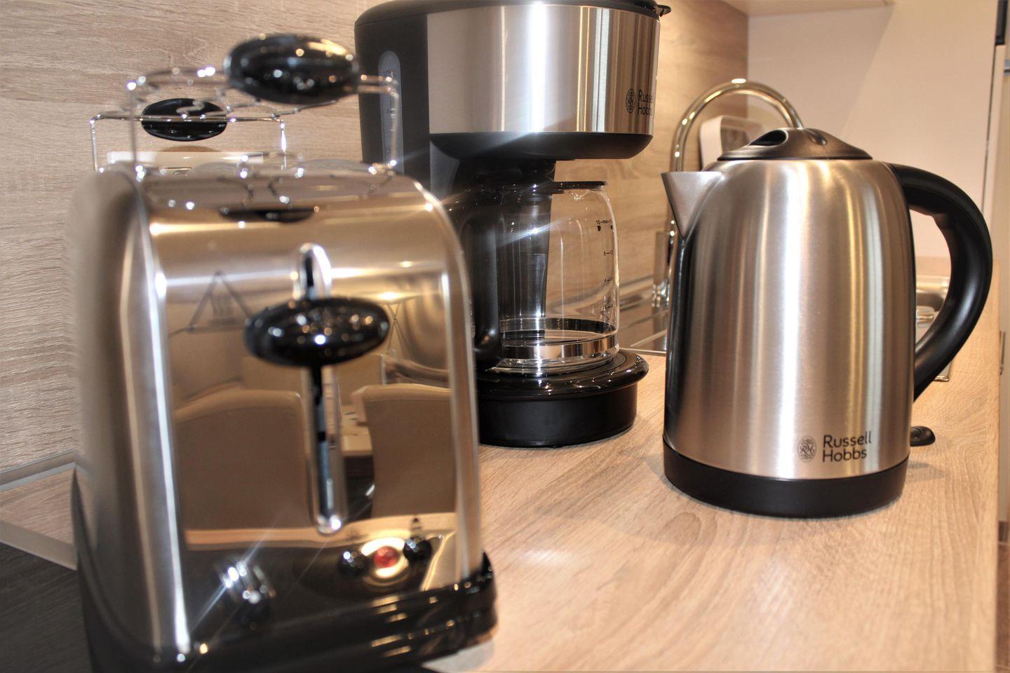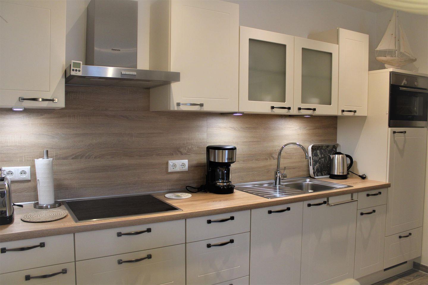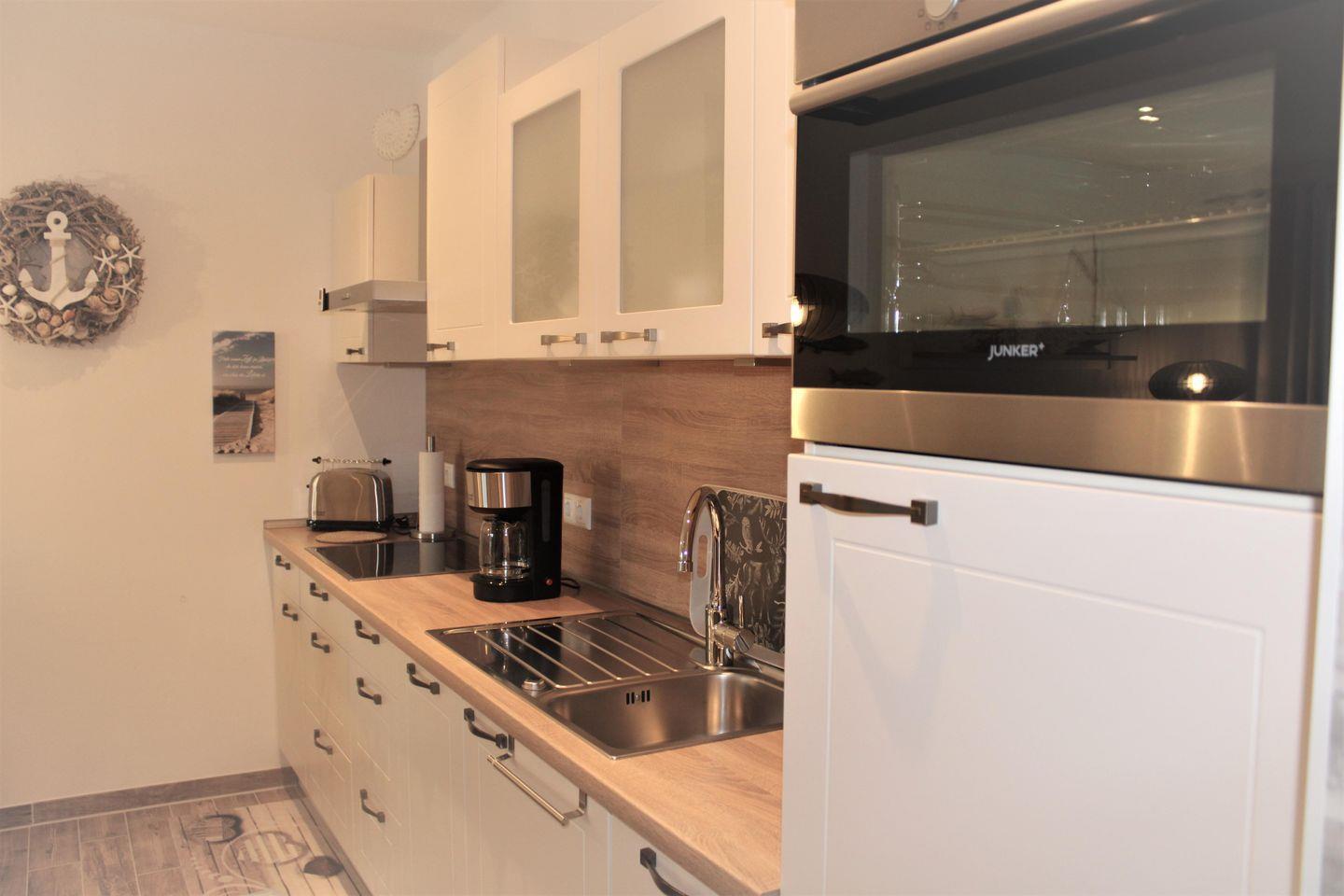 Küche und Haushalt: Einbauküche, Kühlschrank mit Gefrierfach, 4-Zonen Cerankochfeld, Backofen, Dunstabzugshaube, Geschirrspüler, Kaffeefiltermaschine, Toaster, Wasserkocher, hochwertiges Geschirr und Besteck