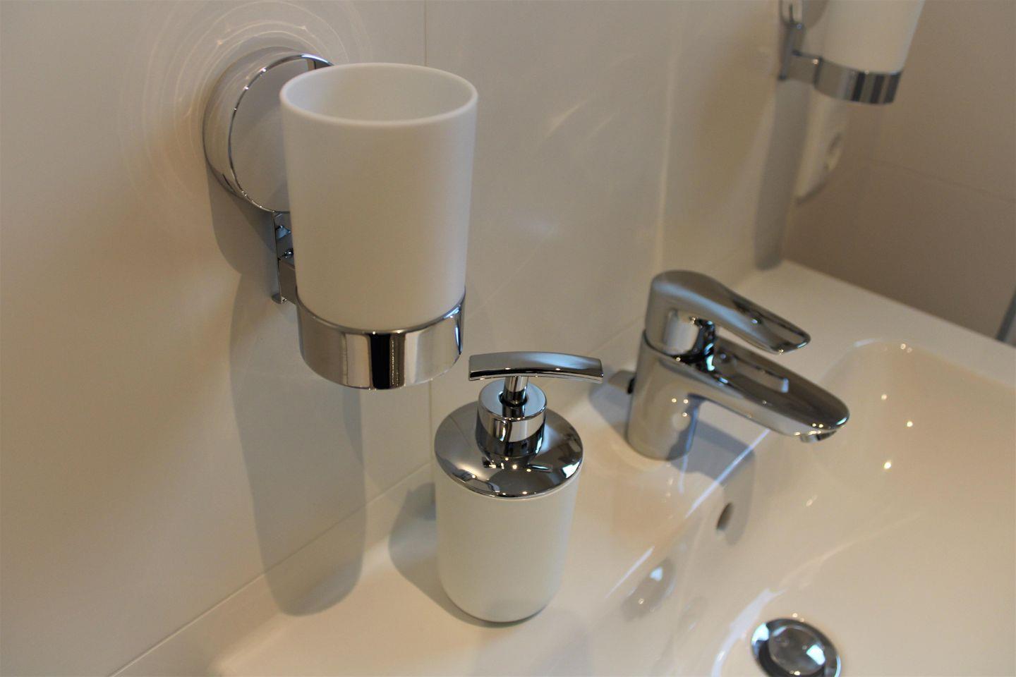 Bad und Sanitär: bodentiefe, barrierefreie Sommerregendusche, Waschtischanlage mit Spiegel, WC, Handtuchheizung, Handtücher auf Anfrage (1 Duschtuch + 2 Handtücher)