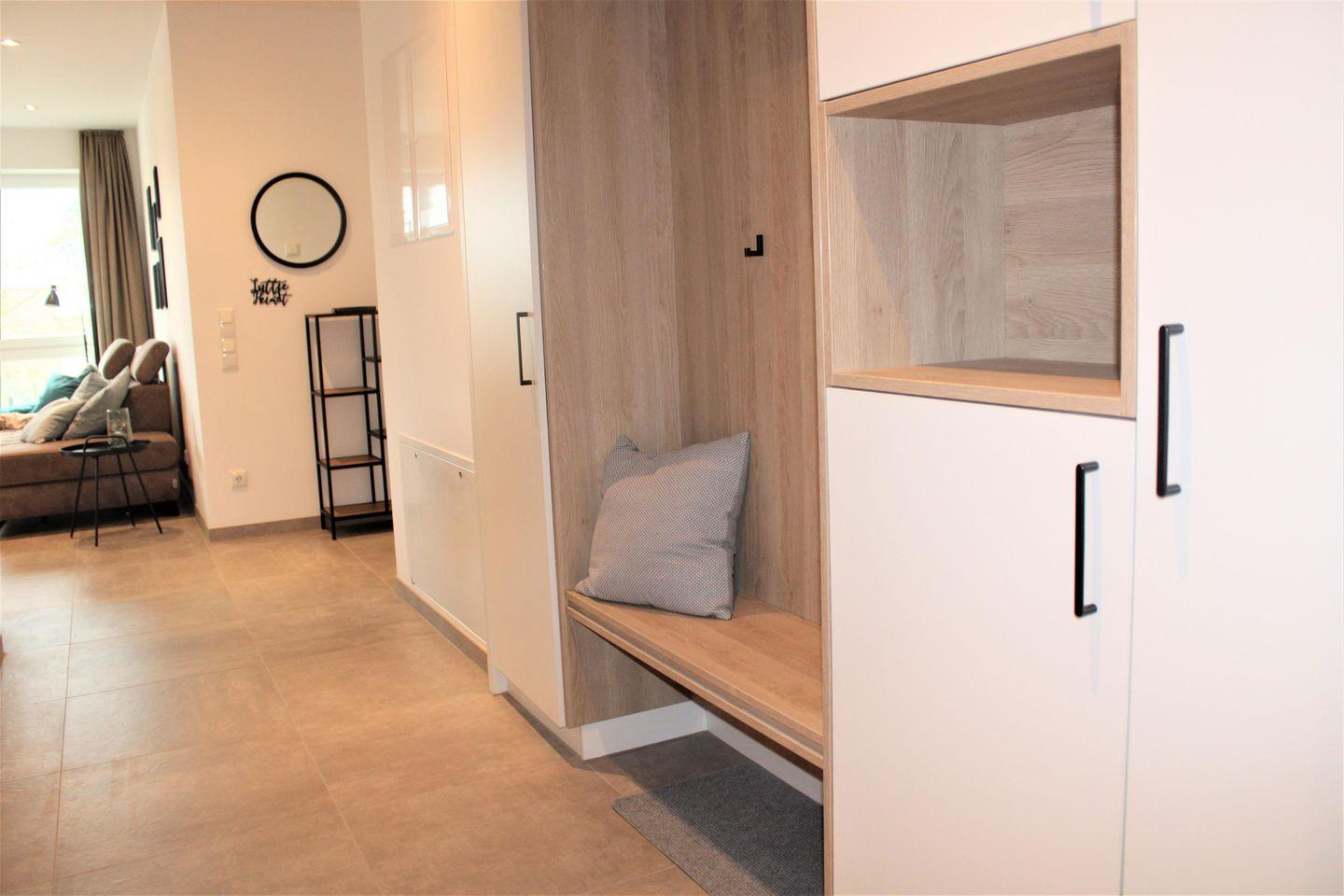 Flur: Flur mit Garderobe, Schuh- und Garderobenschrank, Bügelbrett, Staubsauger, Besen, Handfeger mit Kehrblech, Eimer und Bodenwischer, Wäscheständer