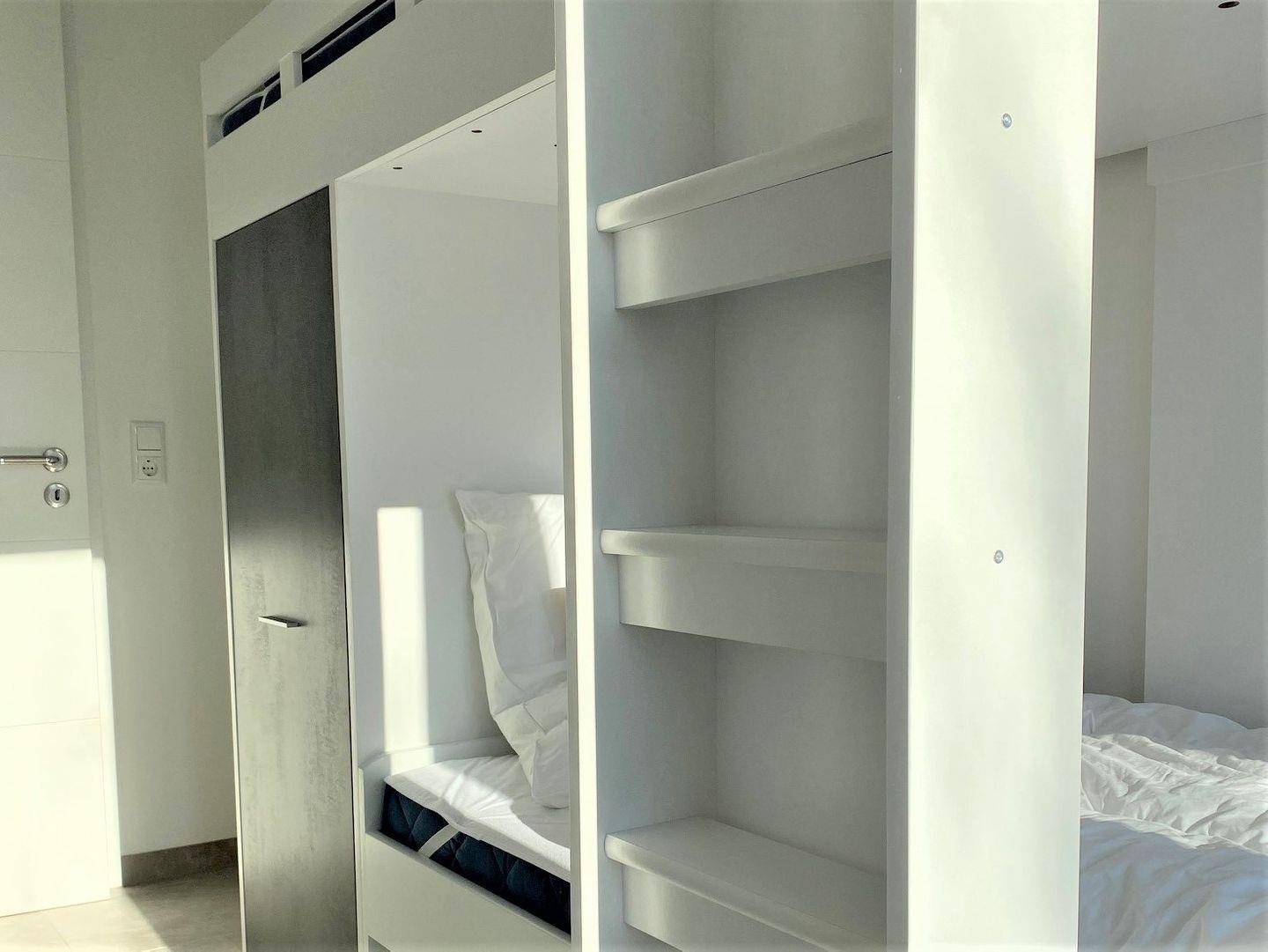 Das geschmackvoll eingerichtete Nichtraucher-Apartment verfügt über kostenfreies WLAN. Der Wohnbereich bietet eine voll ausgestattete offene Küchenzeile mit Geschirrspüler, Kühlschrank mit Gefrierfach, Backofen, Kaffeemaschine, Kaffeepad Maschine (Senseo), Toaster, Wasserkocher und integrierter Mikrowelle sowie einen Flatscreen-Smart TV. Das Apartment verfügt über einen Esstisch für 4 Personen und einen behaglichen Sitzbereich. Zwei separate Schlafzimmer mit jeweils einem Doppelbett und 1 Etagenbett stehen Ihnen zur Verfügung. Das Elternschlafzimmer verfügt zudem über einen eigenen Flatscreen-TV mit einem separaten Bereich für ihr Office.