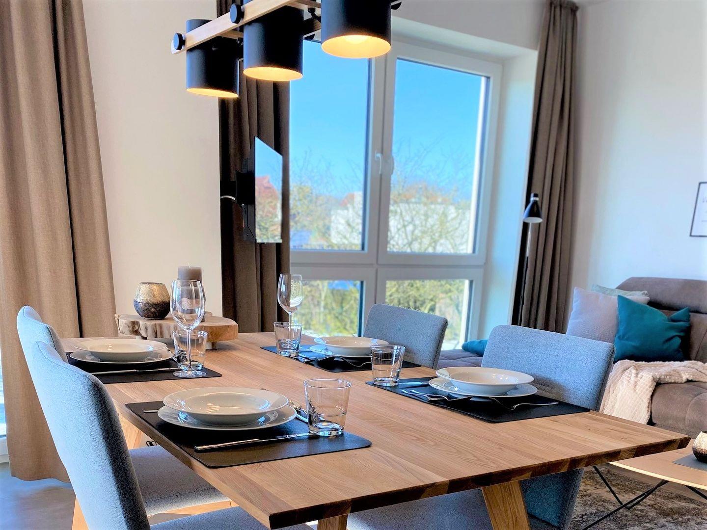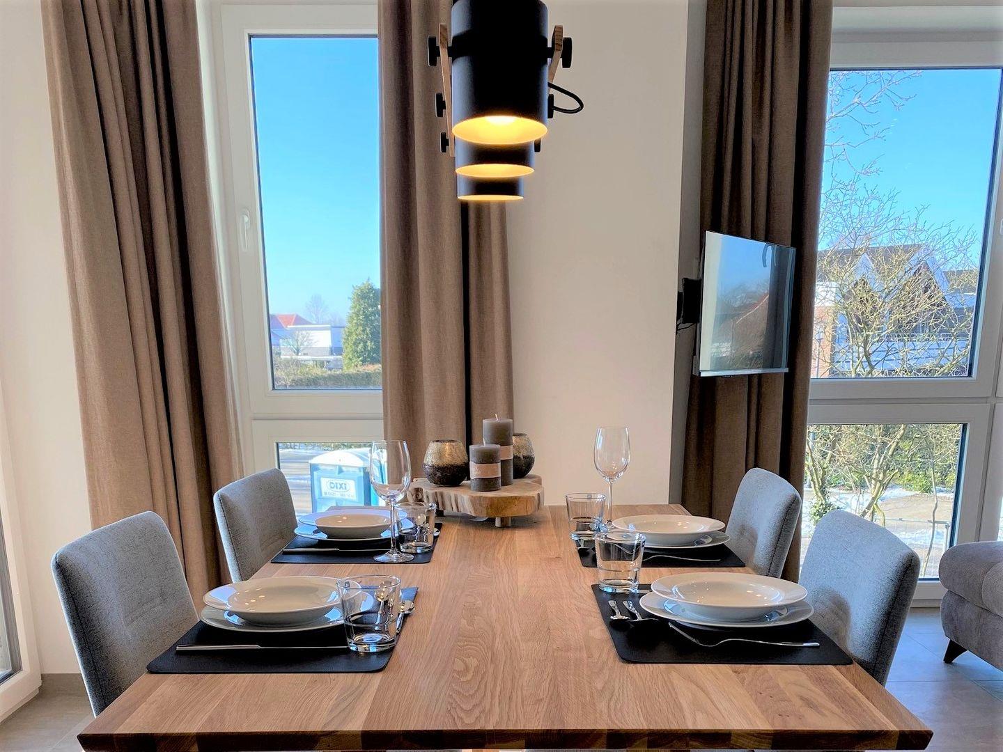 Esszimmer: großer Tisch mit 4 bequemen Stühlen