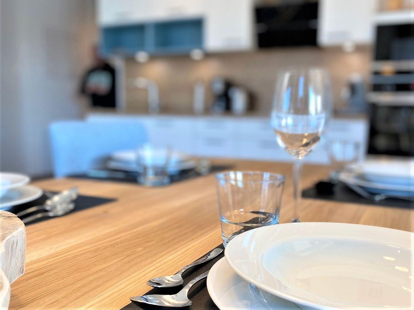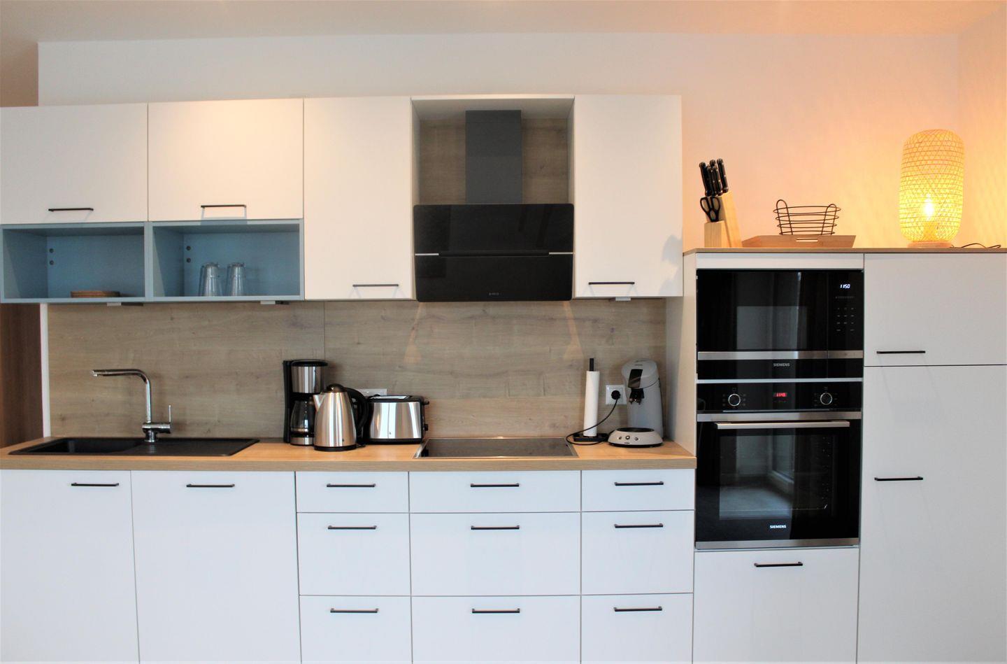 Küche und Haushalt: Einbauküche, Kühlschrank mit Gefrierfach, 4-Zonen Cerankochfeld, Backofen, Mikrowelle (integriert), Dunstabzugshaube, Geschirrspüler, Toaster, Wasserkocher, Kaffeefiltermaschine, Kaffeepad Maschine, hochwertiges Geschirr und Besteck