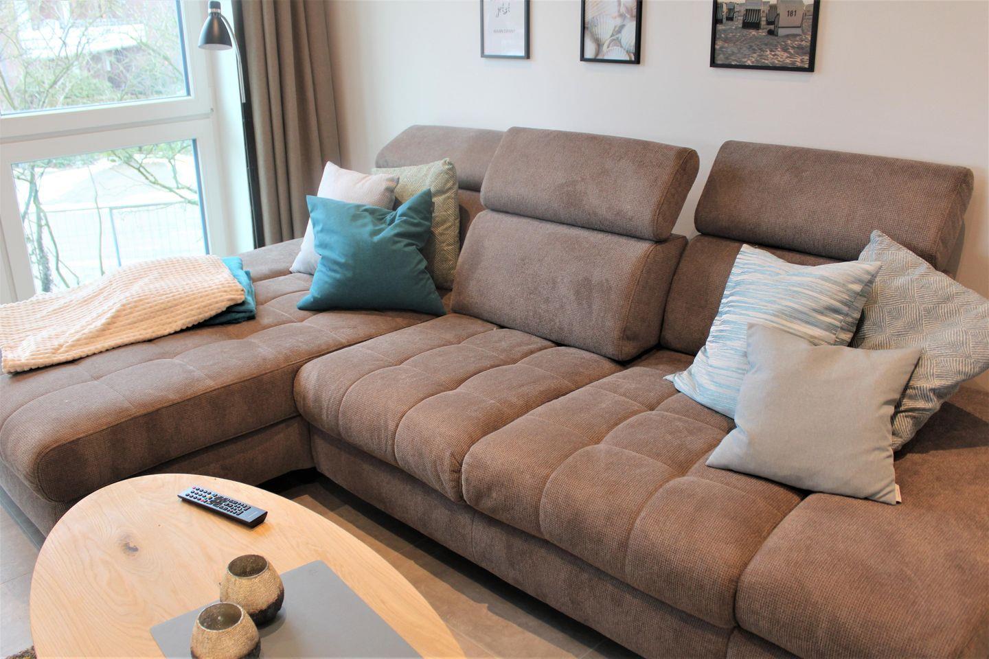Wohnzimmer: gemütliche Sitzecke mit verstellbarer Sitztiefe, Leselampe, Flachbildfernseher, Empfang deutschsprachiger TV-Programme (SAT-Anlage)