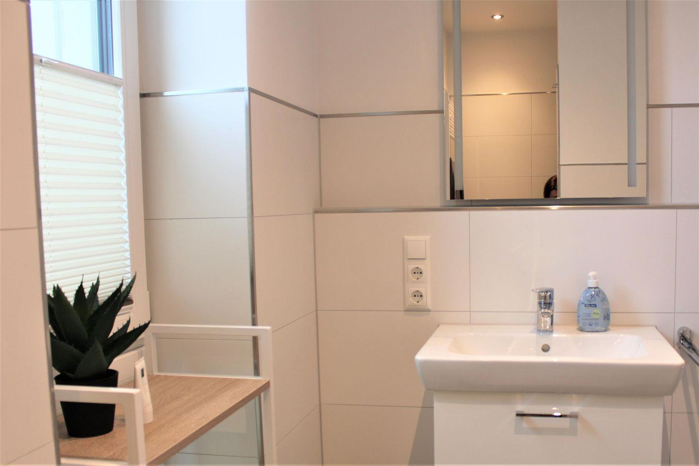 Bad und Sanitär: bodentiefe, barrierefreie Sommerregendusche, Waschtischanlage mit Spiegel, Föhn, WC, Handtuchheizungen