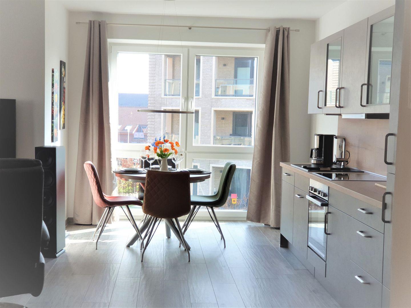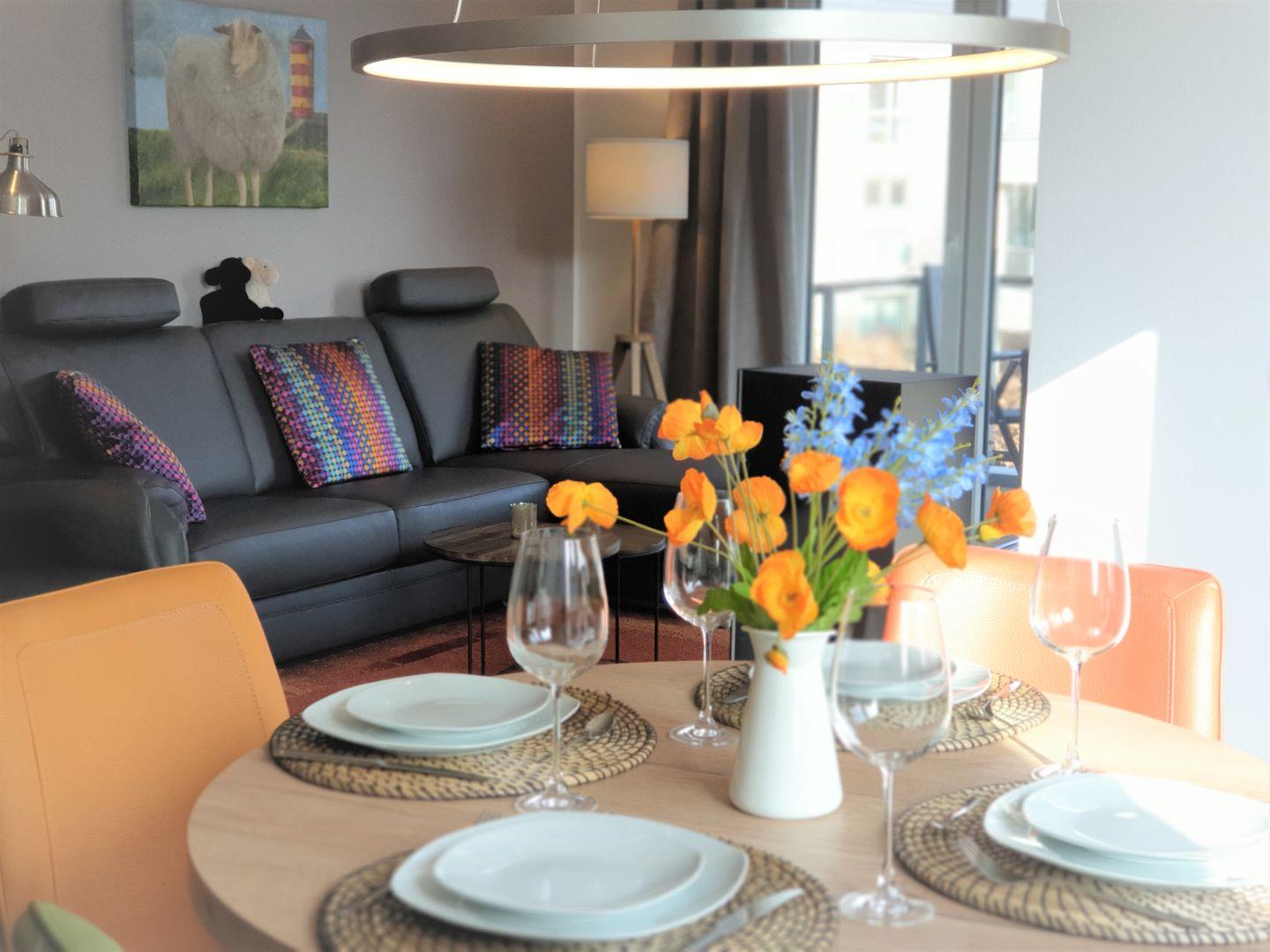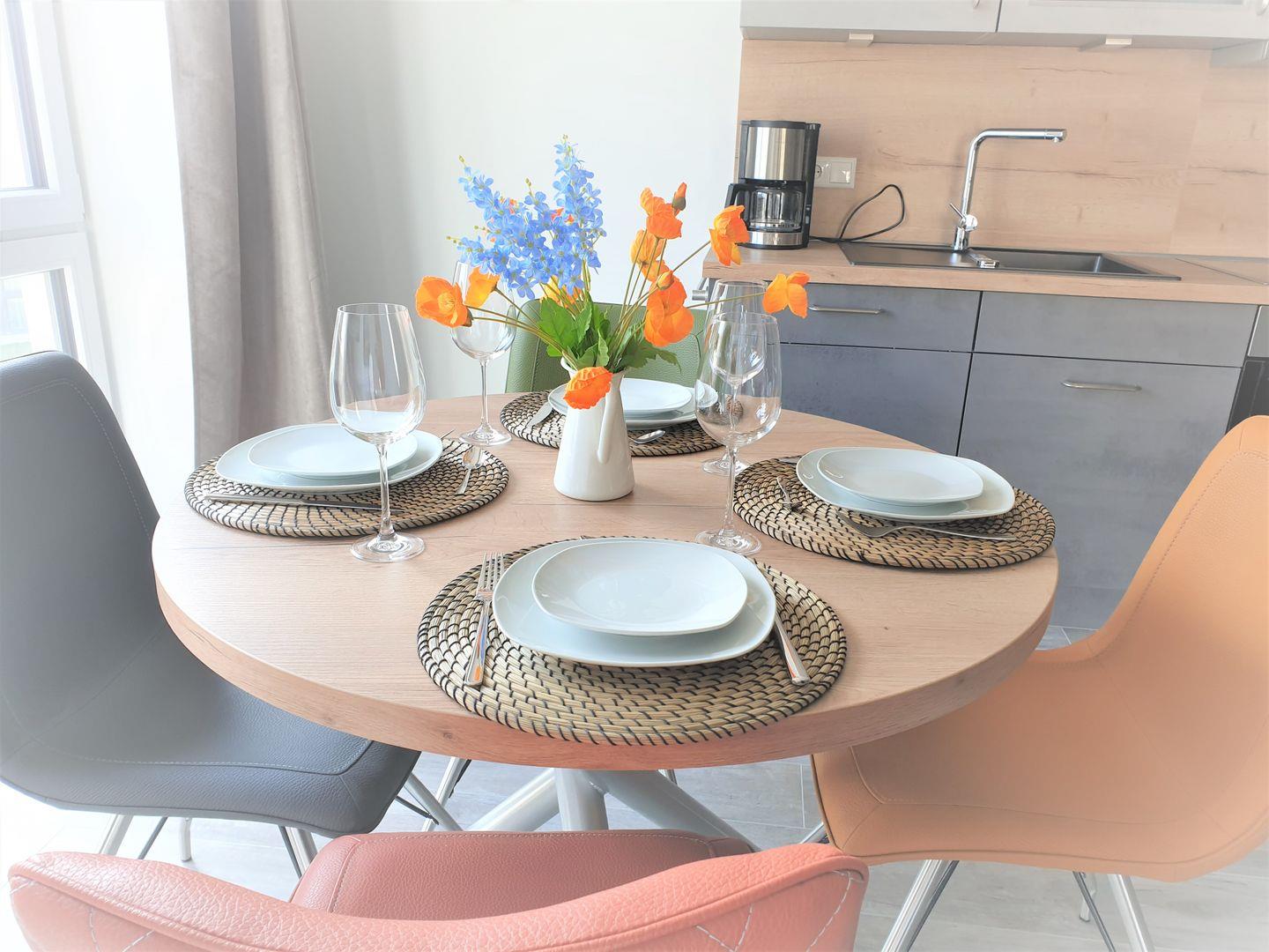 Der lichtdurchflutete Wohn- Essraum bietet eine vollausgestattete Küche mit Waschmaschine, eine Schlafcouch und Wohlfühlambiente.“