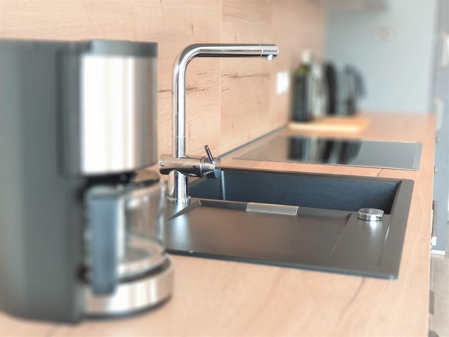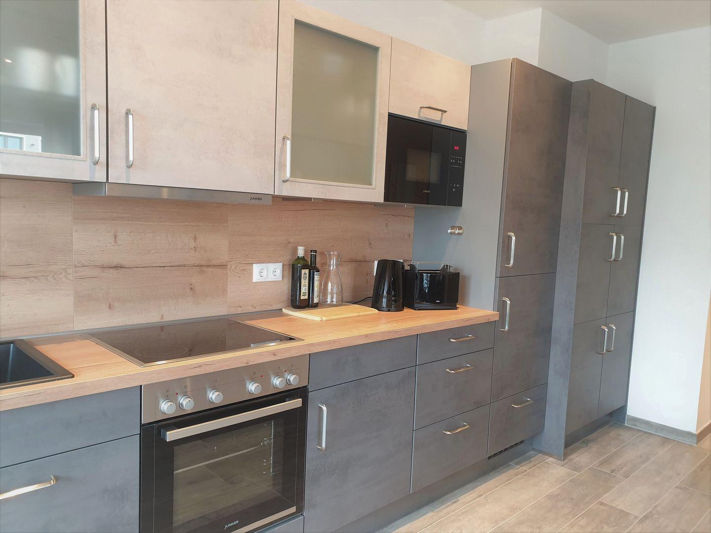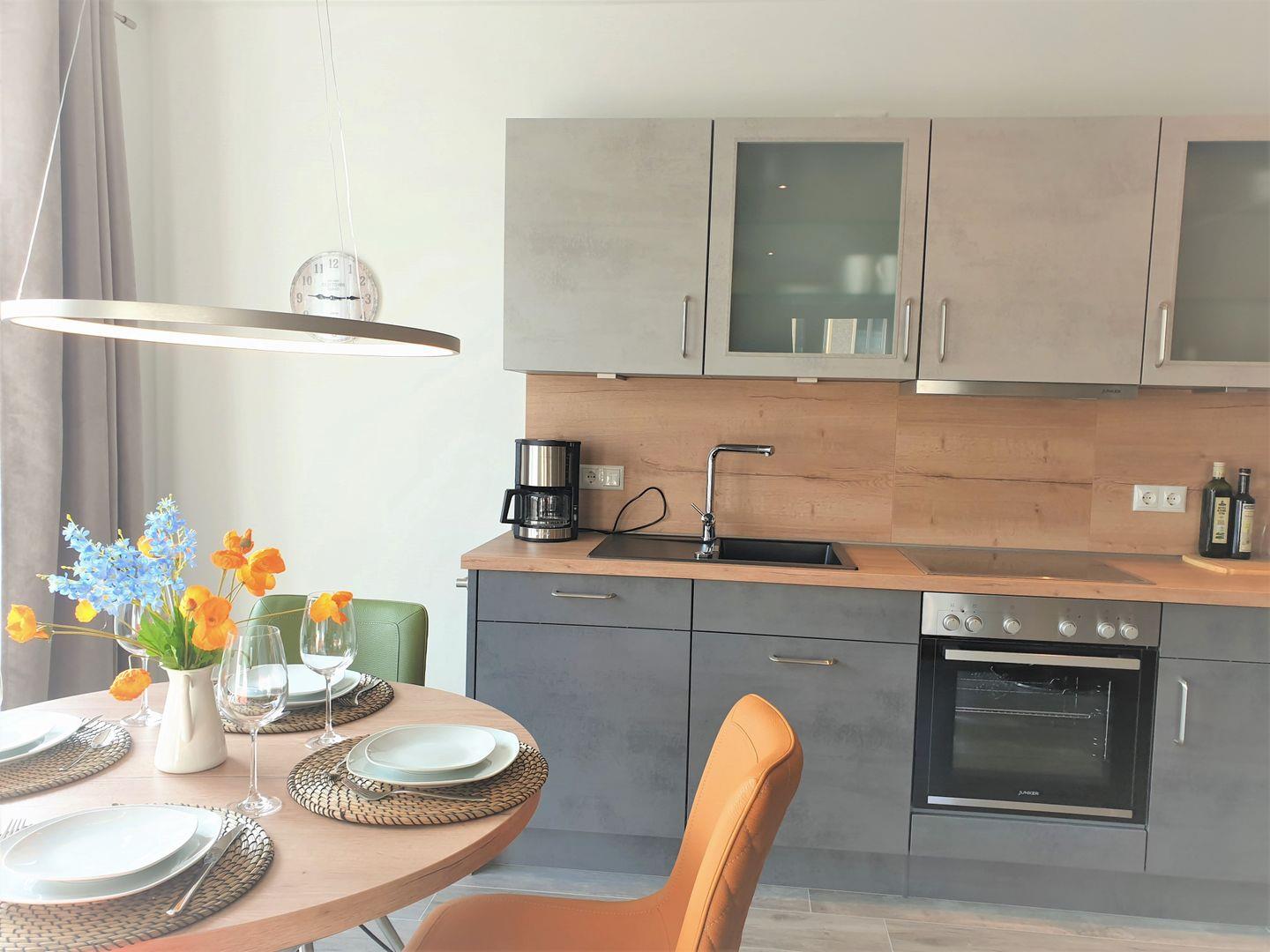 Küche und Haushalt: Einbauküche, Kühlschrank mit Gefrierfach, 4-Zonen Cerankochfeld, Backofen, Dunstabzugshaube, Geschirrspüler, Mikrowelle, Kaffeefiltermaschine, Toaster, Wasserkocher, hochwertiges Geschirr und Besteck