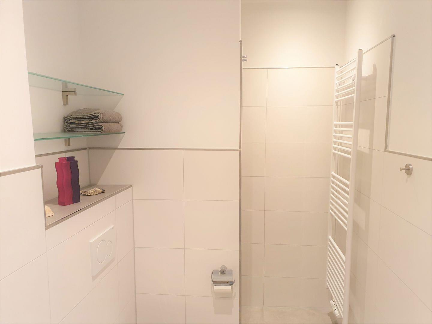 Bad und Sanitär: bodentiefe, barrierefreie Sommerregendusche, Waschtischanlage mit Spiegel, WC, Handtuchheizung, Handtücher (1 Duschtuch + 2 Handtücher) und Bettwäsche auf Anfrage