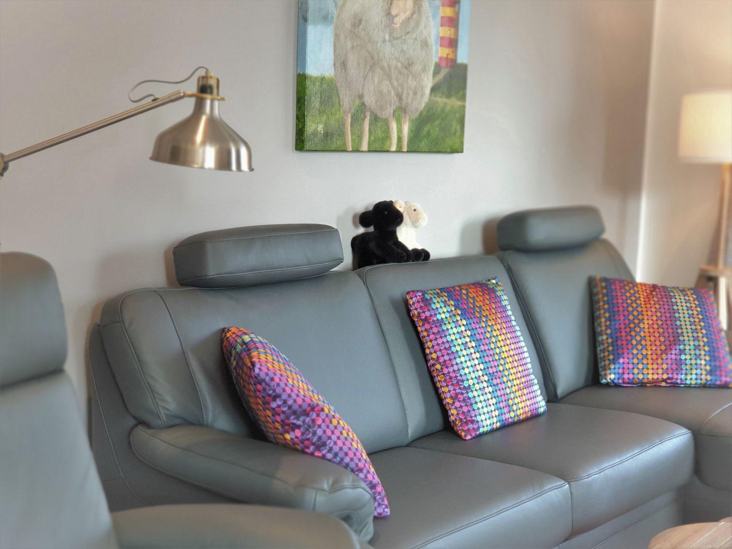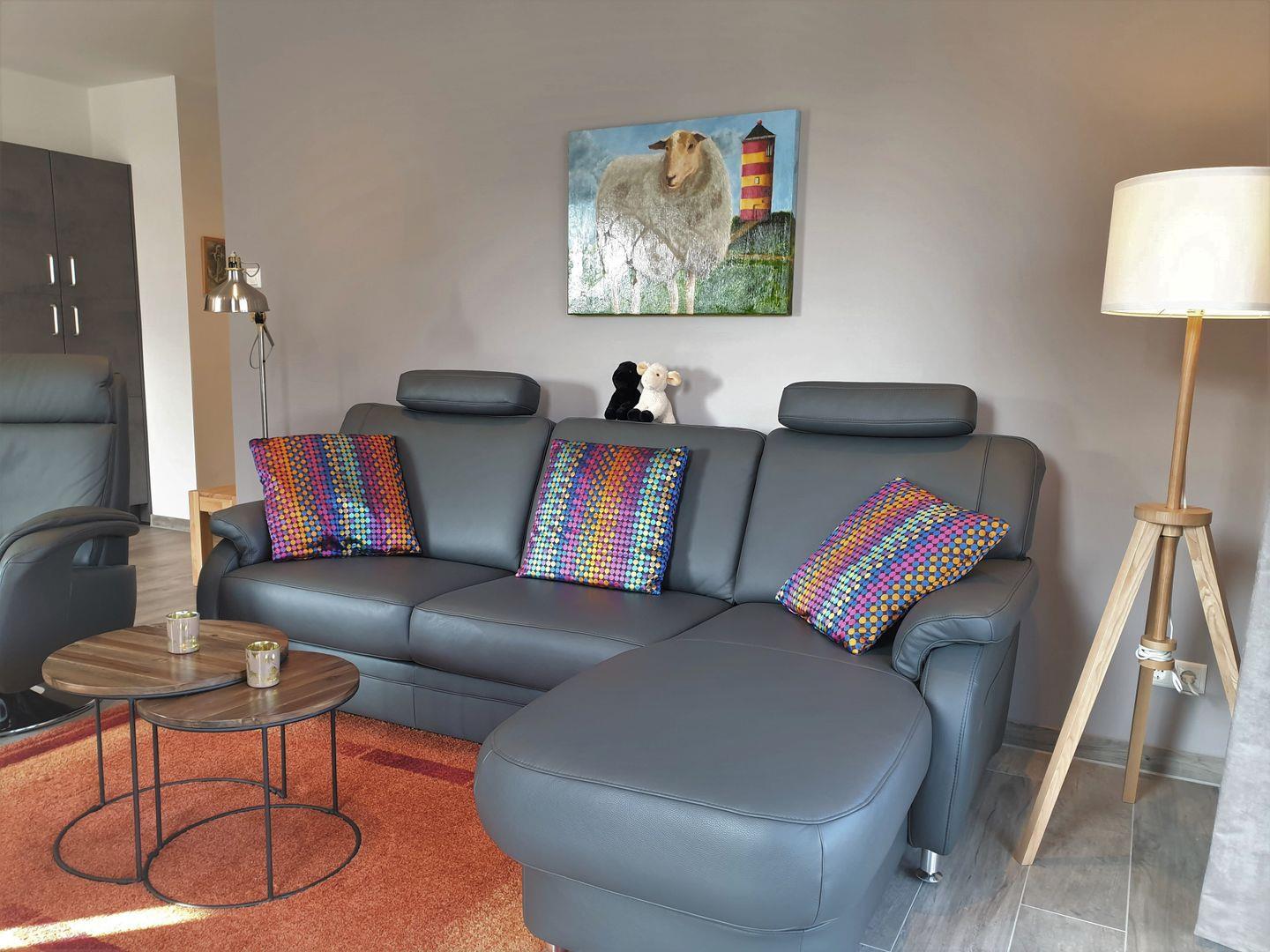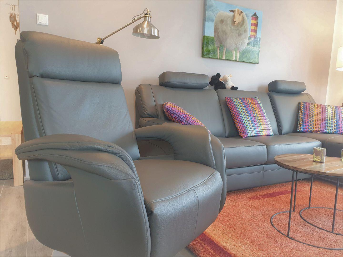 Wohnzimmer: gemütliche Couch mit Ausziehfunktion, Sessel, Flachbildfernseher, Empfang deutschsprachiger TV-Programme (SAT-Anlage)