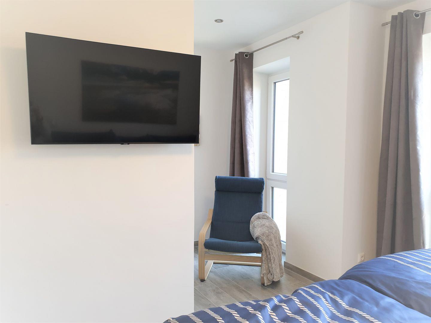 Das Schlafzimmer ist großzügig eingerichtet und bietet 2 Personen ausreichend Platz in einem 2x2 -Meter Echtholzbett (2 Einzelmatratzen à 100x200 cm). Die übergroße Bettwäsche (2,20 * 1,55) wärmt auch die kältesten Füße. Auch findet Ihr neben der himmlischen Ruhe und der erfrischenden Seeluft einen erholsamen Schlaf auf unseren orthopädischen Matratzen. Ach ja, ein Smart-TV sowie ein moderner großer Kleiderschank sind natürlich auch vorhanden.