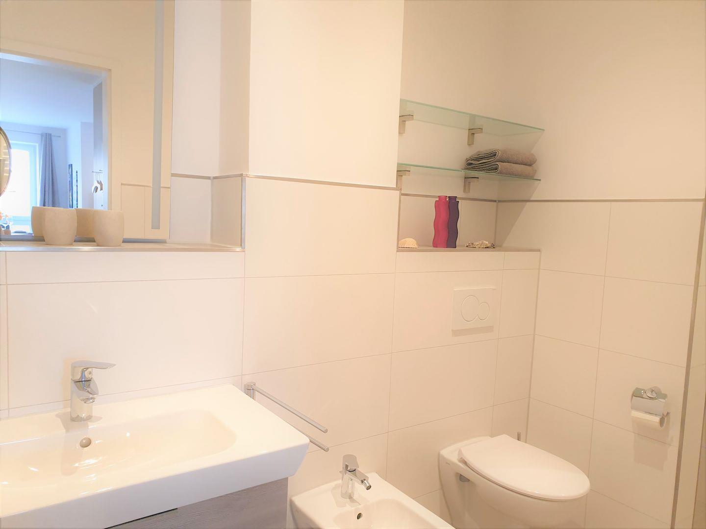 Erstmal angekommen werft Ihr den Anker im 1. OG am Ende des Flurs links. Die 2-Zimmerwohnung bietet ausreichend Platz für 2-4 Personen. Die Wohnung hat ein geräumiges Duschbad mit begehbarer Sommerregendusche, beleuchtetem Spiegel, eingebautem Bad-Radio, Bidet, sowie einen Handtuchwärmer. Utensilien wie Kosmetikspiegel, Fön, Haken sowie großzügige Ablageflächen inklusive.