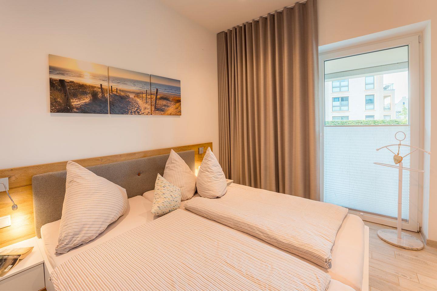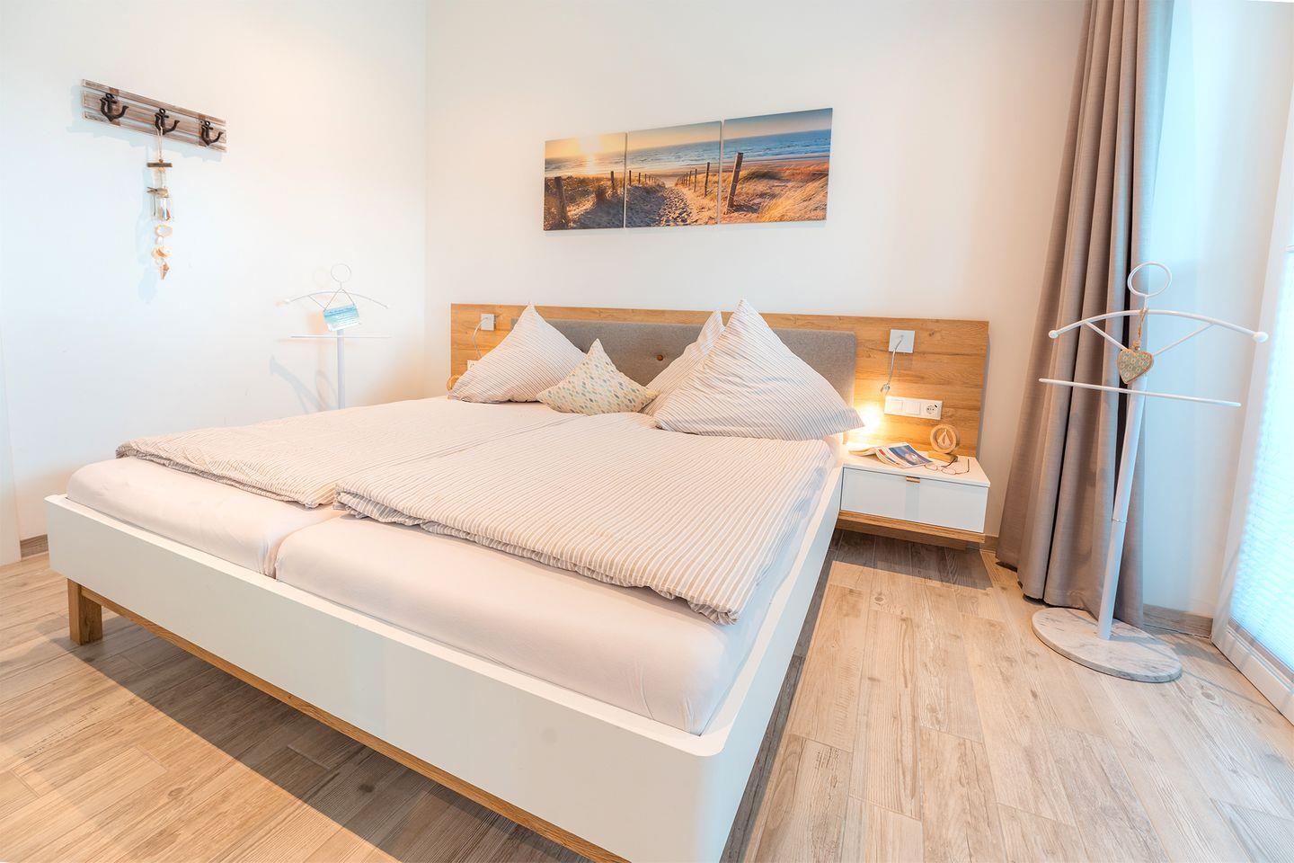 Schlafzimmer: Doppelbett 180 x 200 cm mit 2 Einzelmatratzen, Smart-TV, Leselampen, Schrankwand