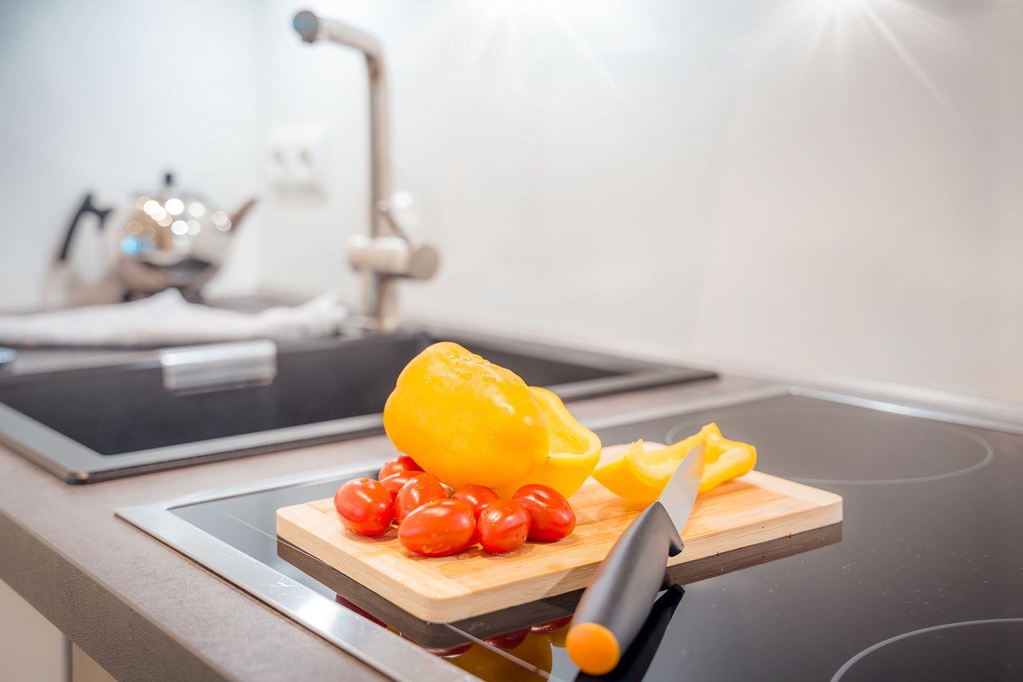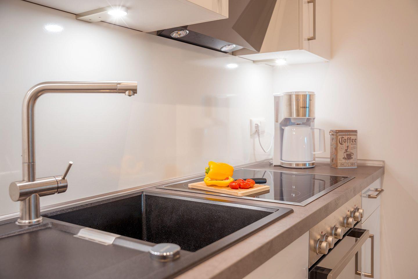 Küche: Einbauküche, Kühlschrank mit Gefrierfach, 4-Zonen Cerankochfeld, Backofen, Dunstabzugshaube, Geschirrspüler, Kaffeefiltermaschine, Toaster, Wasserkocher, hochwertiges Geschirr und Besteck