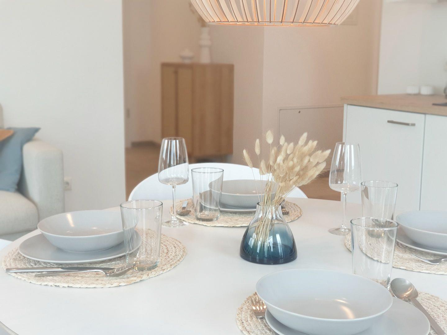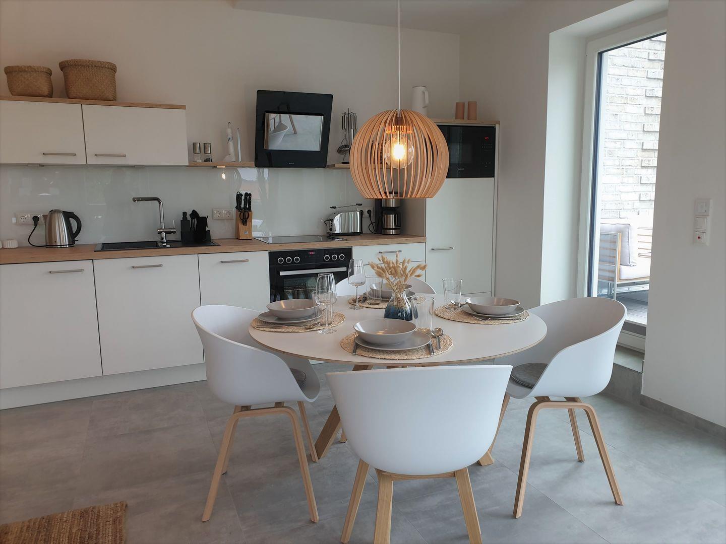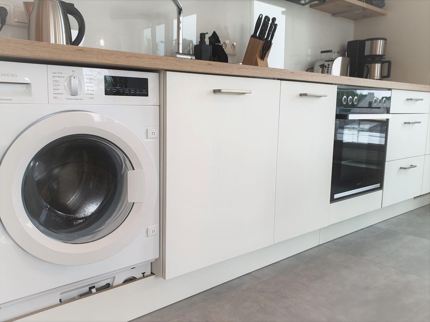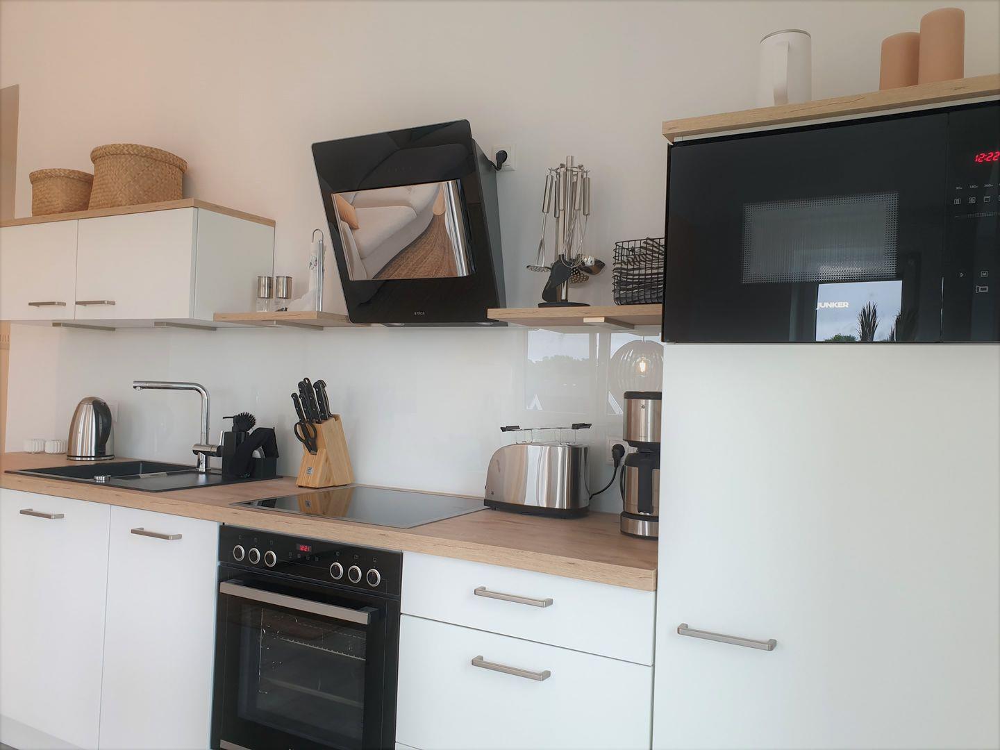 Küche und Haushalt: Einbauküche, Kühlschrank mit Gefrierfach, Ceranherd, Backofen, Mikrowelle, Geschirrspüler, Kaffeefiltermaschine, Toaster, Wasserkocher, Waschmaschine hochwertiges Geschirr und Besteck