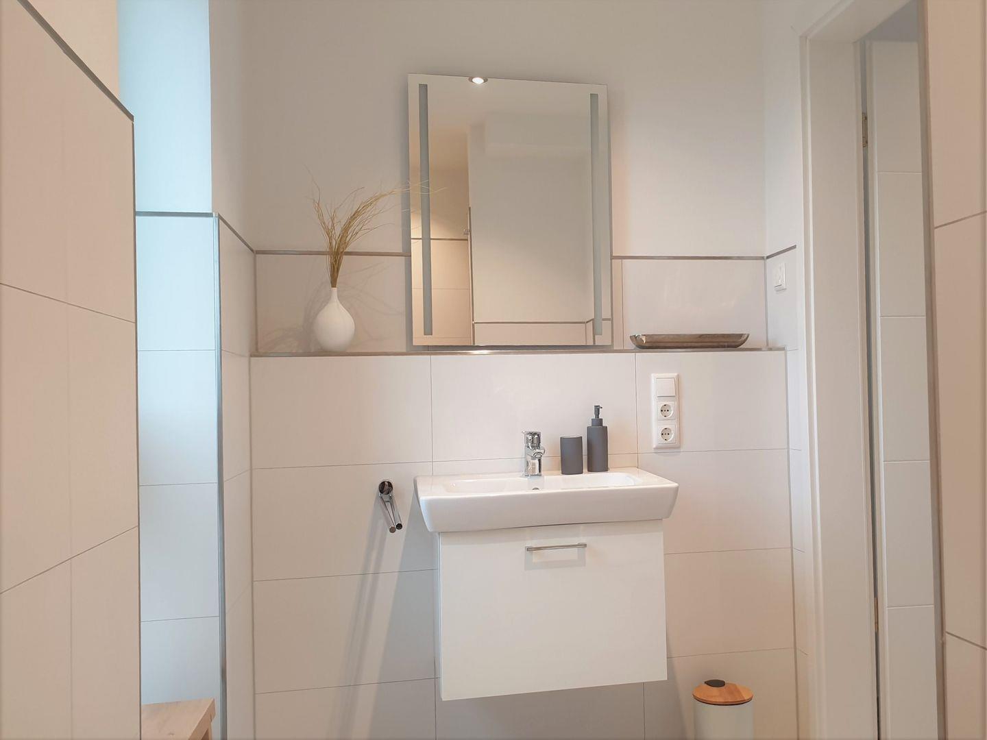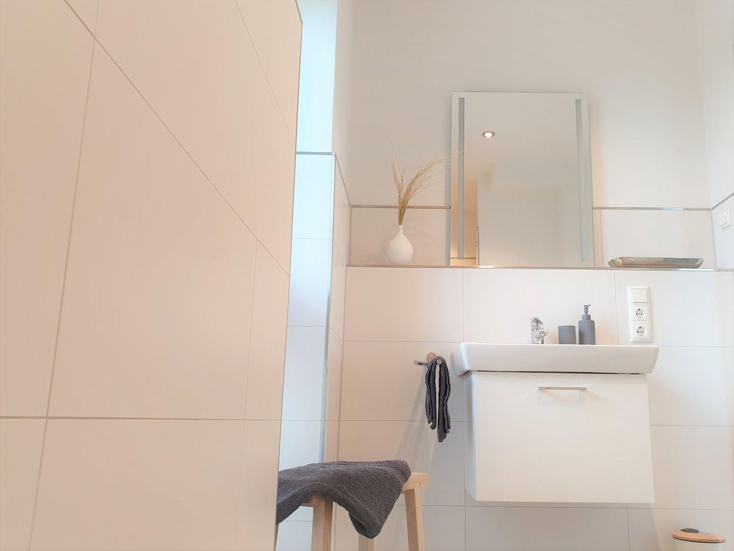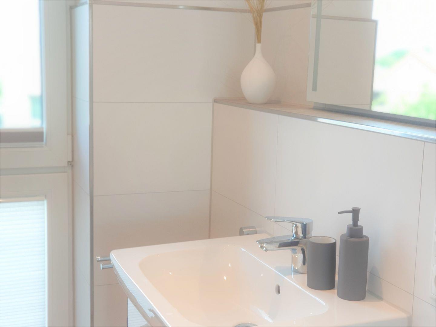 Bad und Sanitär: bodentiefe, barrierefreie Regenwalddusche, Waschtischanlage mit Spiegel, WC, Handtuchheizung, Handtücher (1 Duschtuch + 2 Handtücher) und Bettwäsche auf Anfrage