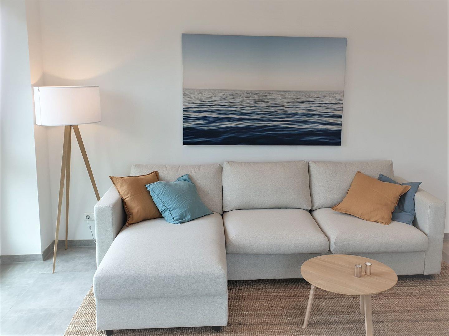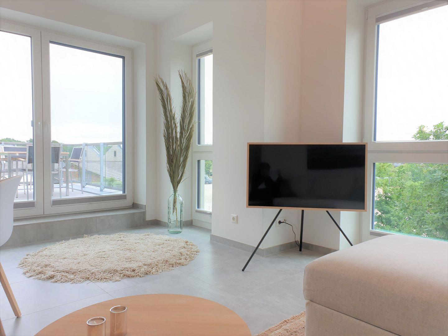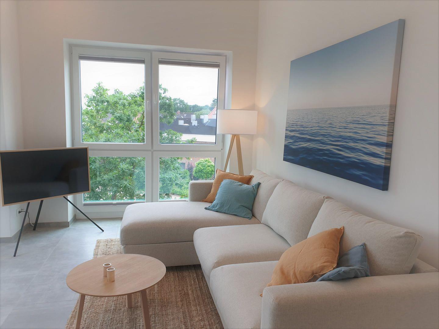 Im Wohnzimmer bietet das ausziehbare Sofa einen vollwertigen Schlafplatz mit Matratze für zwei weitere Gäste.