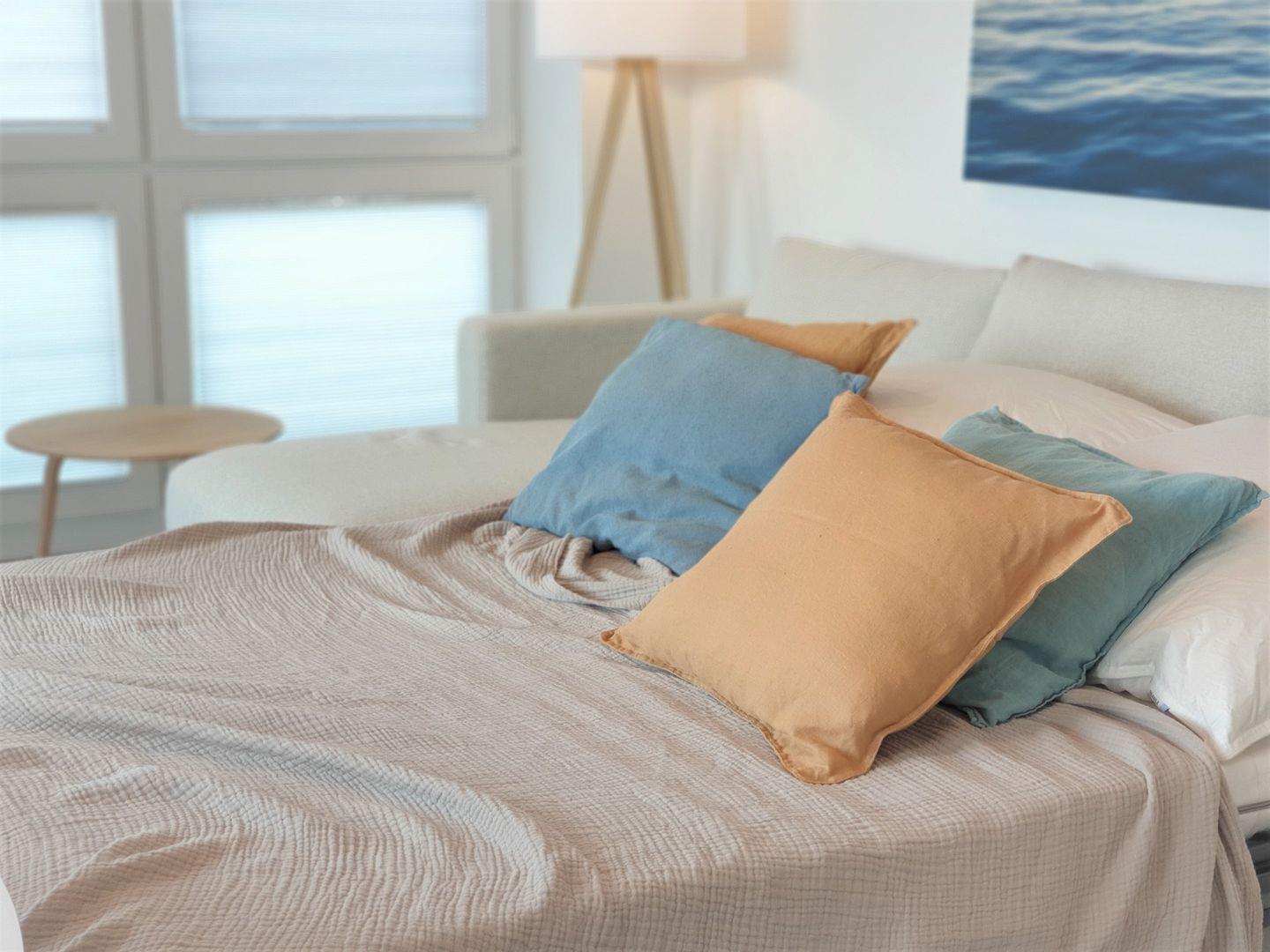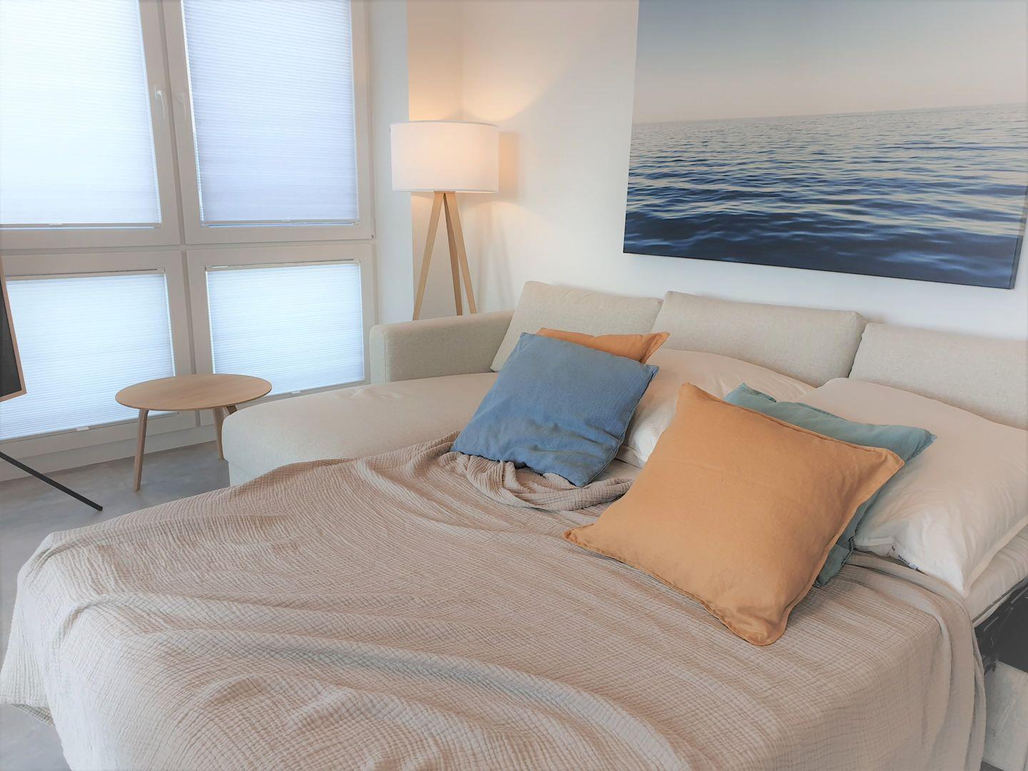 Die ruhige Lage der Wohnung und insbesondere des Schlafzimmers mit eingeschränktem Meerblick garantiert Ihnen eine tiefe Erholung. Atmen Sie die frische Nordseeluft ein und erleben Sie im hochwertigen Boxspringbett ein komfortables Schlaferlebnis der Extraklasse. Ihre Nächte werden zum tiefen Durchatmen.