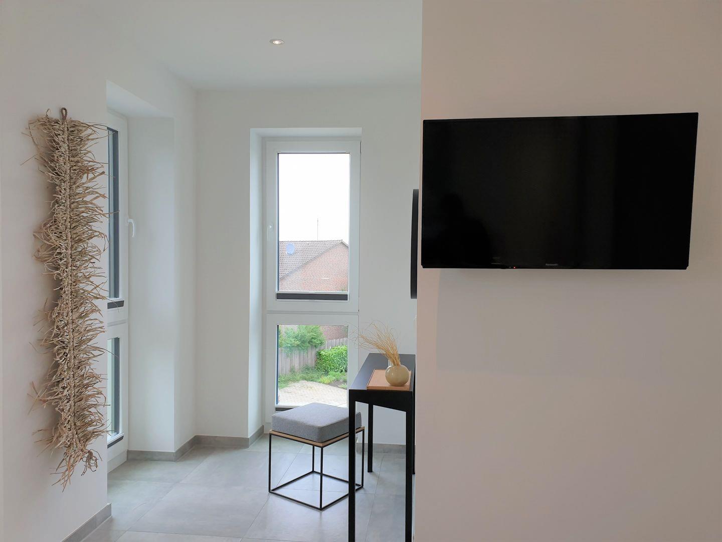 Wohnzimmer: Großes Sofa mit Schlaffunktion (vollwertige Matratze), Smart-TV, Empfang deutschsprachiger TV-Programme, Radio (Bluetooth)