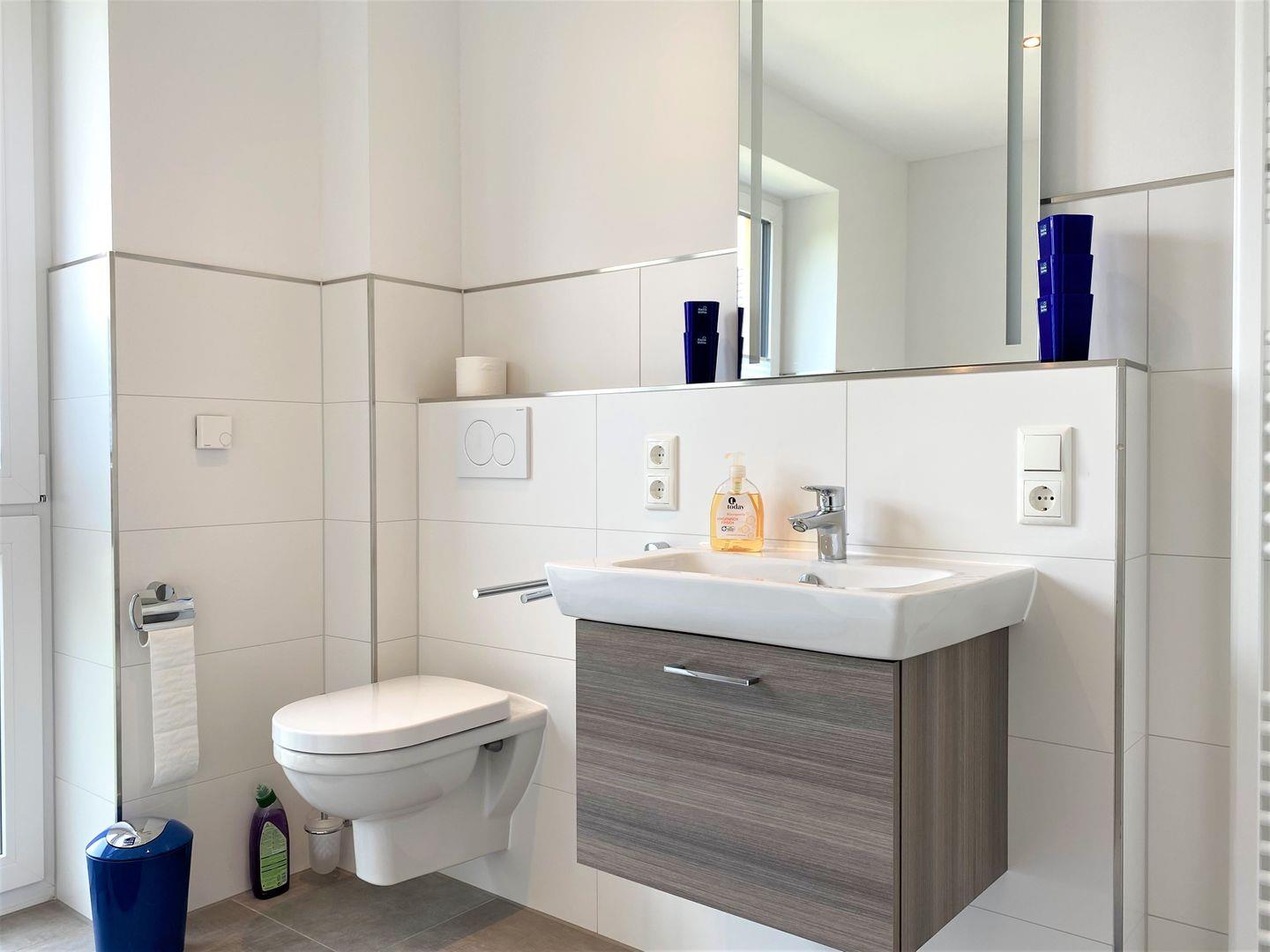 Duschbad im 1. OG: bodentiefe, barrierefreie Dusche, Badewanne, Waschtischanlage mit Spiegel, WC, Handtuchheizung, Föhn