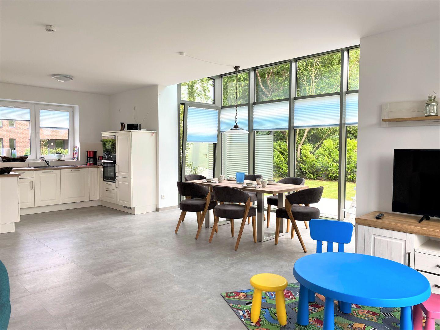 Der großzügige Wohn-Essbereich gibt ein ganz besonderes Raumgefühl und lädt zum Essen, Spielen, Klönen und nettem Beisammensein ein.