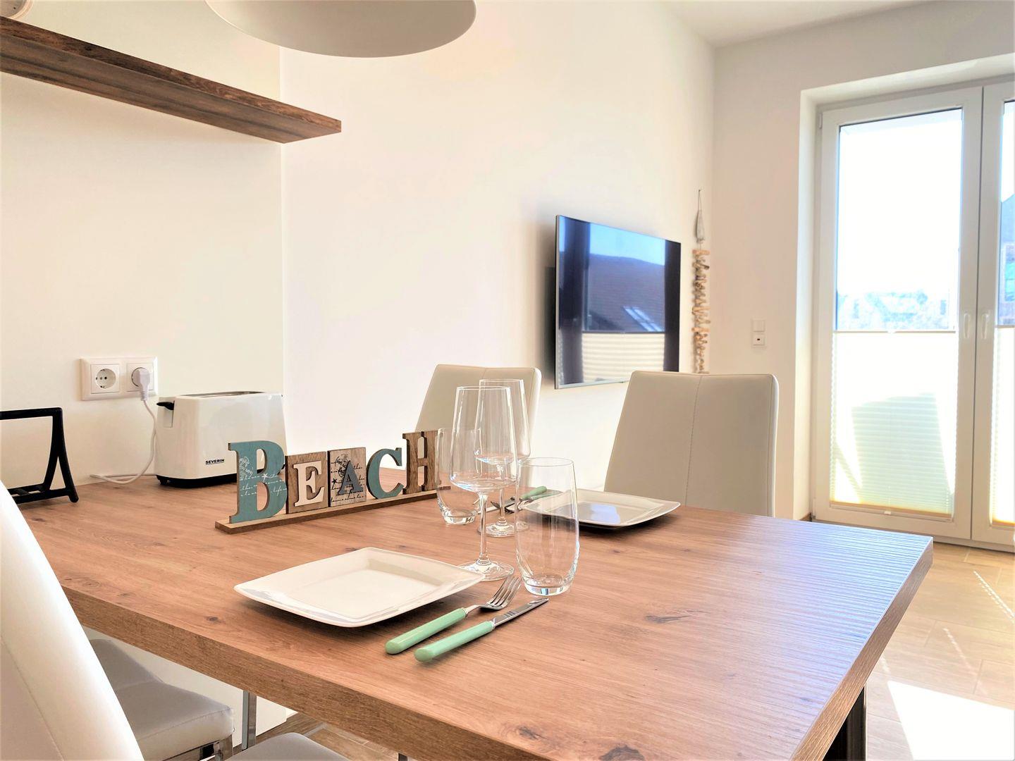 Das Apartment befindet sich in ruhiger Lage, nur wenige Gehminuten vom Deich und Sandstrand entfernt.