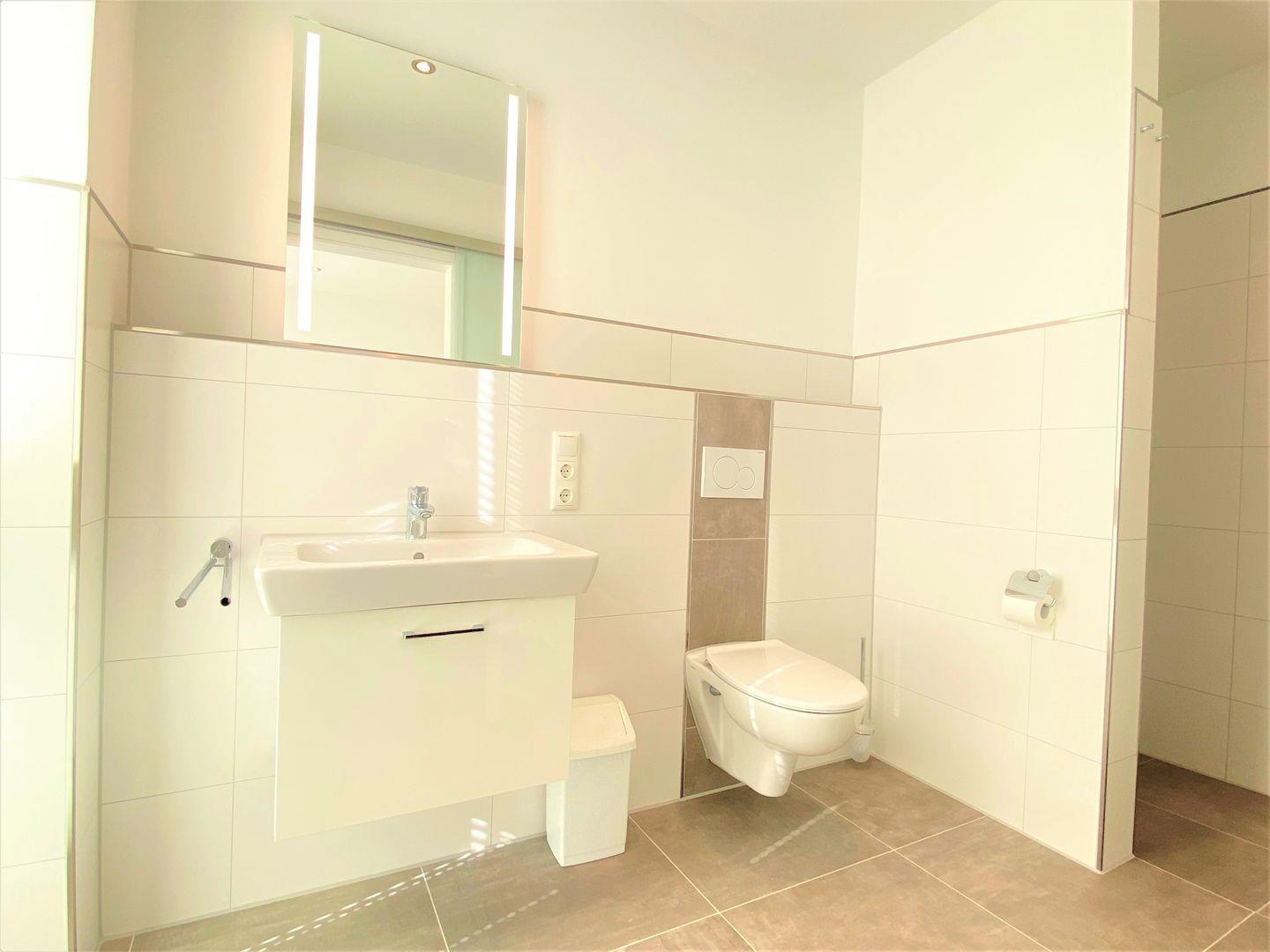 Bad und Sanitär: bodentiefe, barrierefreie Sommerregendusche, Waschmaschine, Trockner, Waschtischanlage mit Spiegel, WC, Föhn, Radio, Handtücher (1 Duschtuch + 2 Handtücher) und Bettwäsche auf Anfrage
