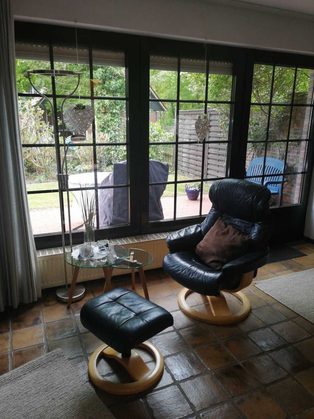 gemütliches Wohnzimmer mit Essecke und Blick in den Süd-Garten.