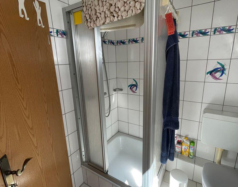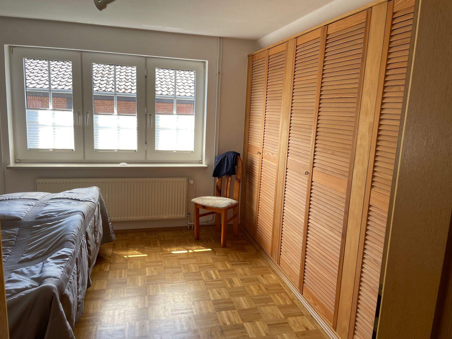 Eine geschlossene Treppe führt in das Obergeschoss. Hier befindet sich das Schlafzimmer mit einem Doppelbett gegenüber ist das kleinere Schlafzimmer mit 1 Einzelbett, auf der gleichen Ebene ist das Duschbad mit Fenster und eine Waschmaschine.