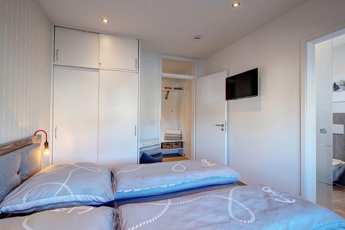 Ebenfalls über den Flur gelangen Sie zum Schlafzimmer. Dort findet Ihre Urlaubsgarderobe Platz in einem geräumigen Einbauschrank . Ihren Koffer können Sie während Ihres Aufenthaltes in einem Abstellraum verstauen. Dort befindet sich auch ein kombinierter Waschmaschinen- Trockner.