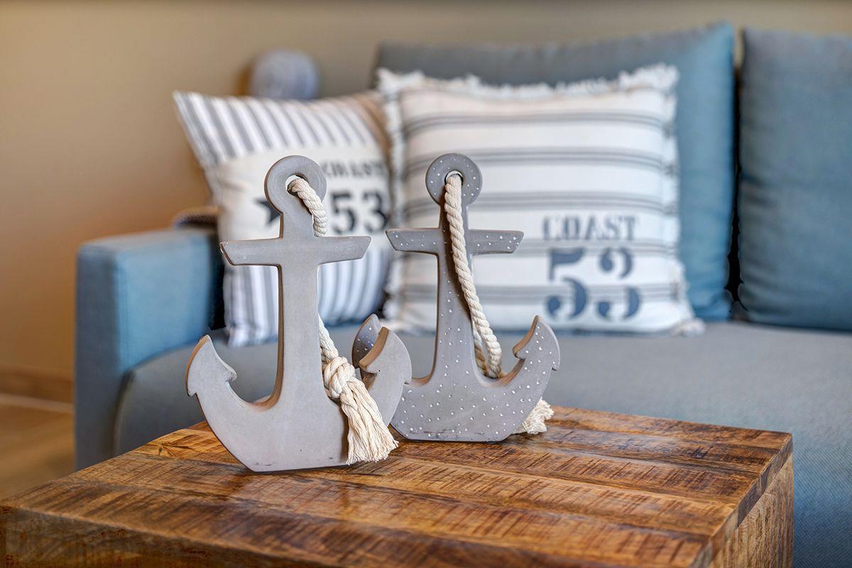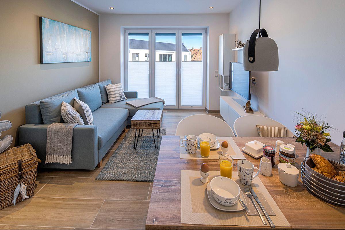Die Wohnung verfügt durchgehend über Fußbodenheizung und WLAN. Sie betreten durch den mit einer großzügigen Garderobe und Spiegel ausgestatteten Flur den behaglich gestalteten Wohn- und Essbereich mit offener Küche. Schlichtes Design im skandinavischen Stil und maritime Accessoires sorgen für ein modernes und gemütliches Ambiente.
