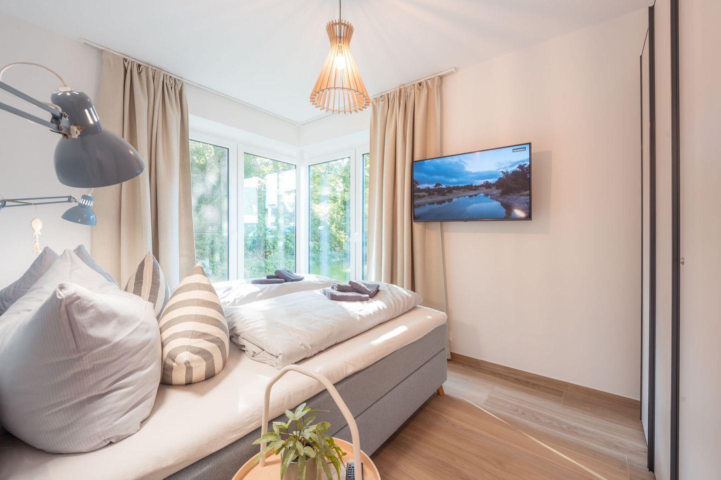 Schlafzimmer 2: 2 Einzelbetten (Boxspringbett 100 x 200 cm) , Flat-TV ebenfalls mit Unterstützung von Streamingdiensten über Apps oder eigene Geräte, Leselampen, Kleiderschrank, Verdunklungsgardinen, Bettwäsche auf Anfrage