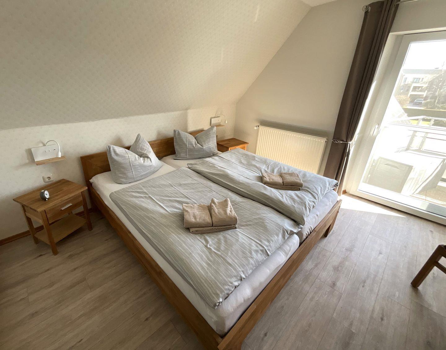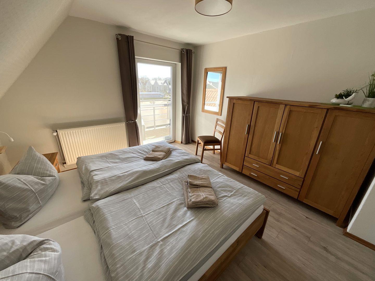 Das Schlafzimmer verfügt über ein Doppelbett (Maße: 180 x 200 cm) mit 2 Einzelmatratzen, antiallergischen Bettdecken und Kissen. Ein 4-türiger Wäscheschrank bietet viel Stauraum für Ihre Kleidung. Hier kann nach Bedarf auch ein Kinderbett zugestellt werden, ein Rausfallschutz und ein Hochstuhl stehen ebenfalls zur Verfügung. Mit Zugang auf den Balkon haben Sie morgens gleich die Sonne auf Ihrer Seite.