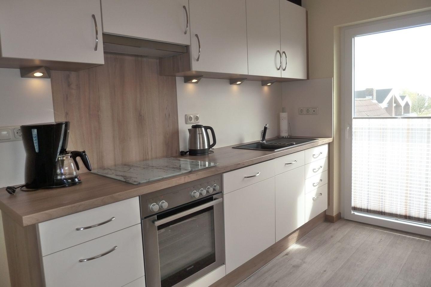 In der Küche befindet sich eine Einbauküche mit Herd, Dunstabzugshaube, Kühlschrank und Geschirrspüler. An Kleingeräten gehören natürlich auch eine Mikrowelle, Kaffeemaschine, Toaster und Wasserkocher zur Ausstattung. Das Geschirr und Besteck ist großzügig ausgelegt, damit auch der Geschirrspüler voll wird. Von der Küche gehen Sie direkt auf den Balkon.