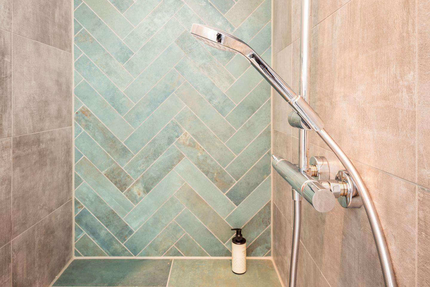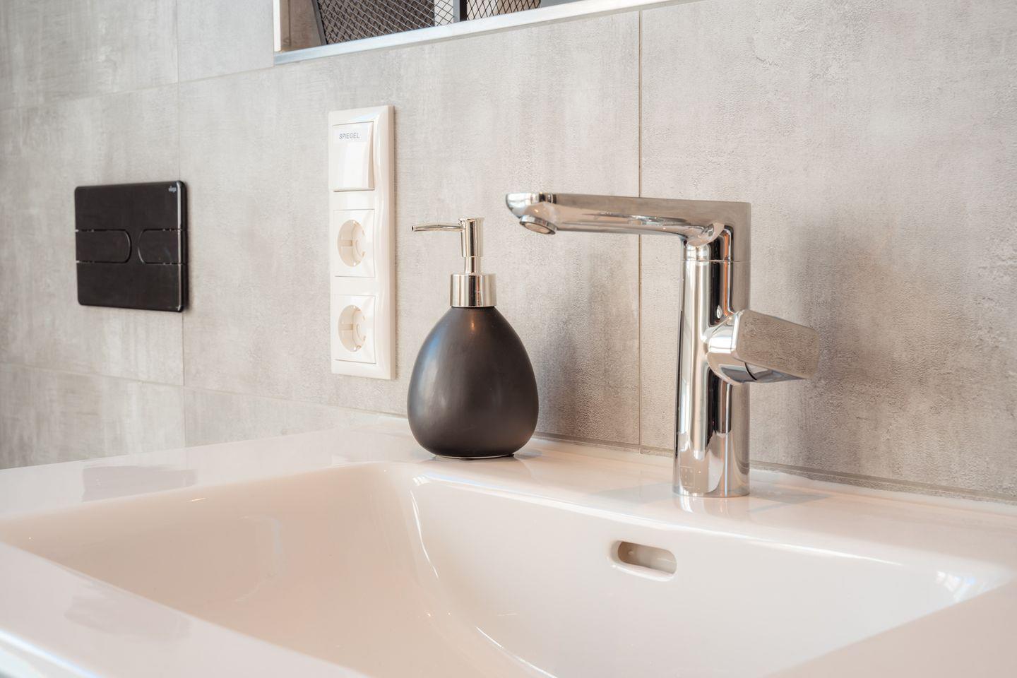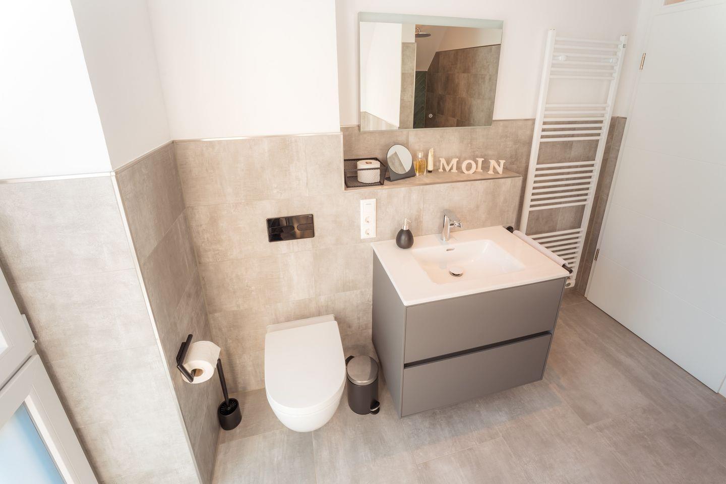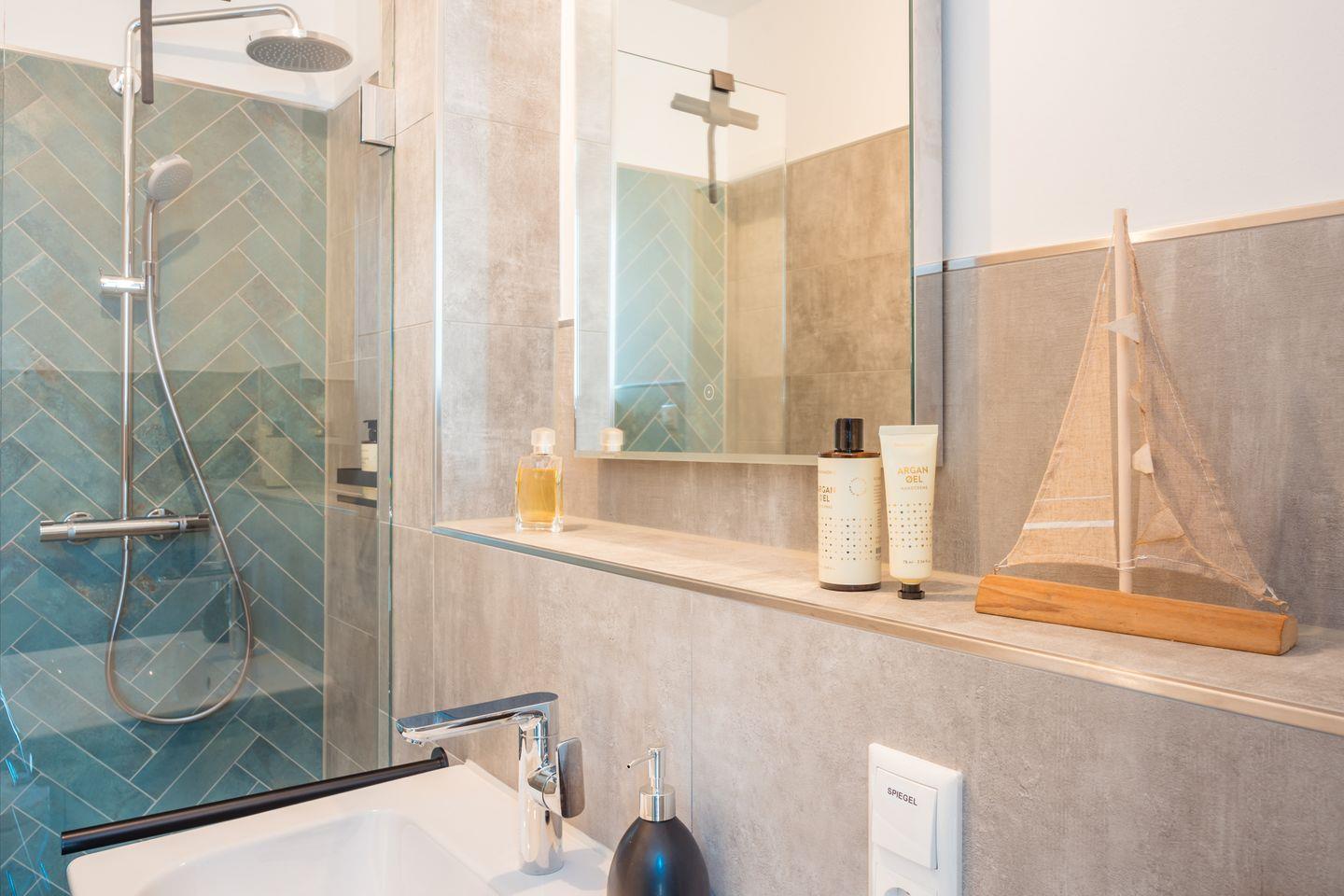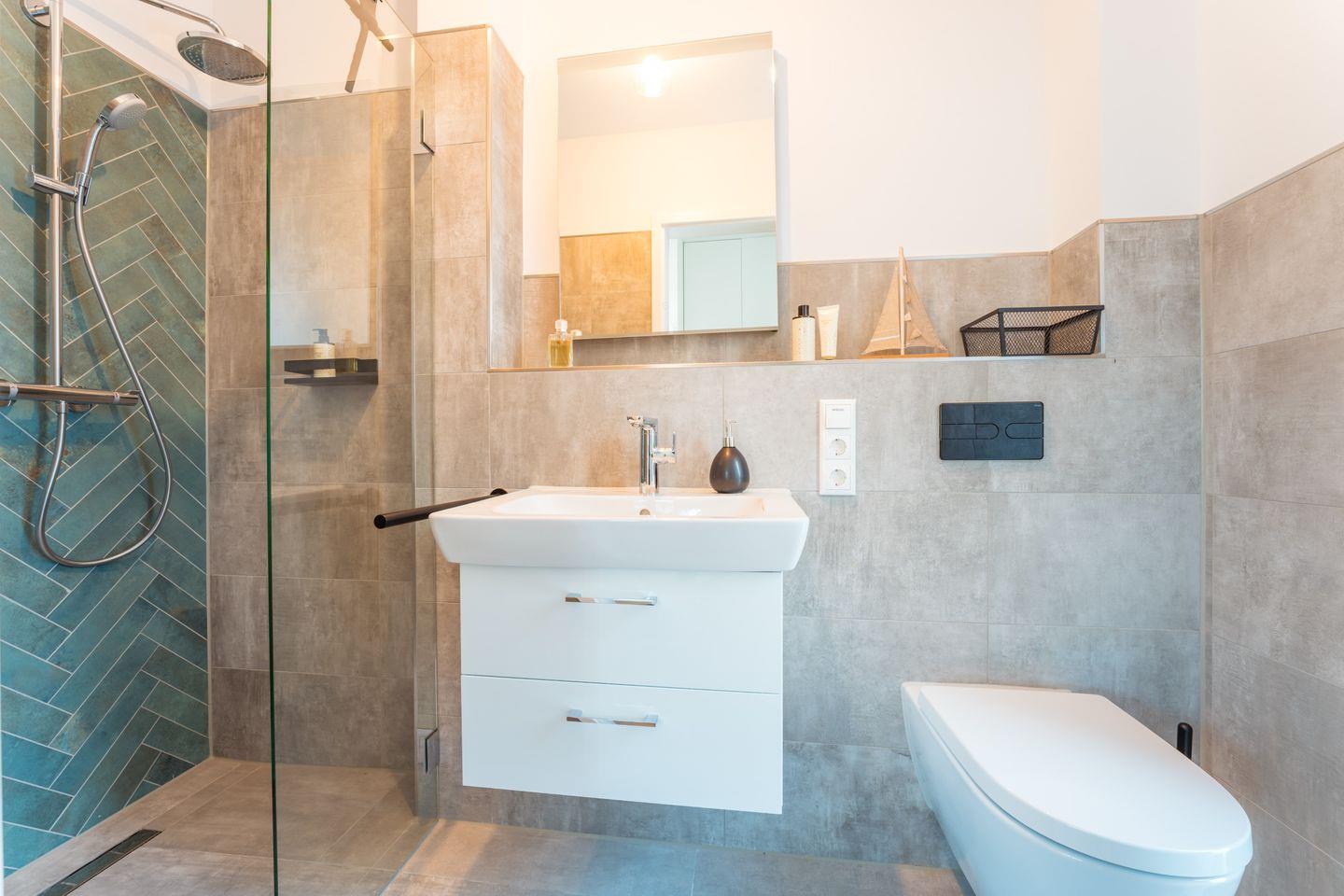Duschbad im EG: bodentiefe, barrierefreie Regendusche, Waschtischanlage mit Spiegel, Abstellflächen, WC, Kindertritthocker, Haartrockner