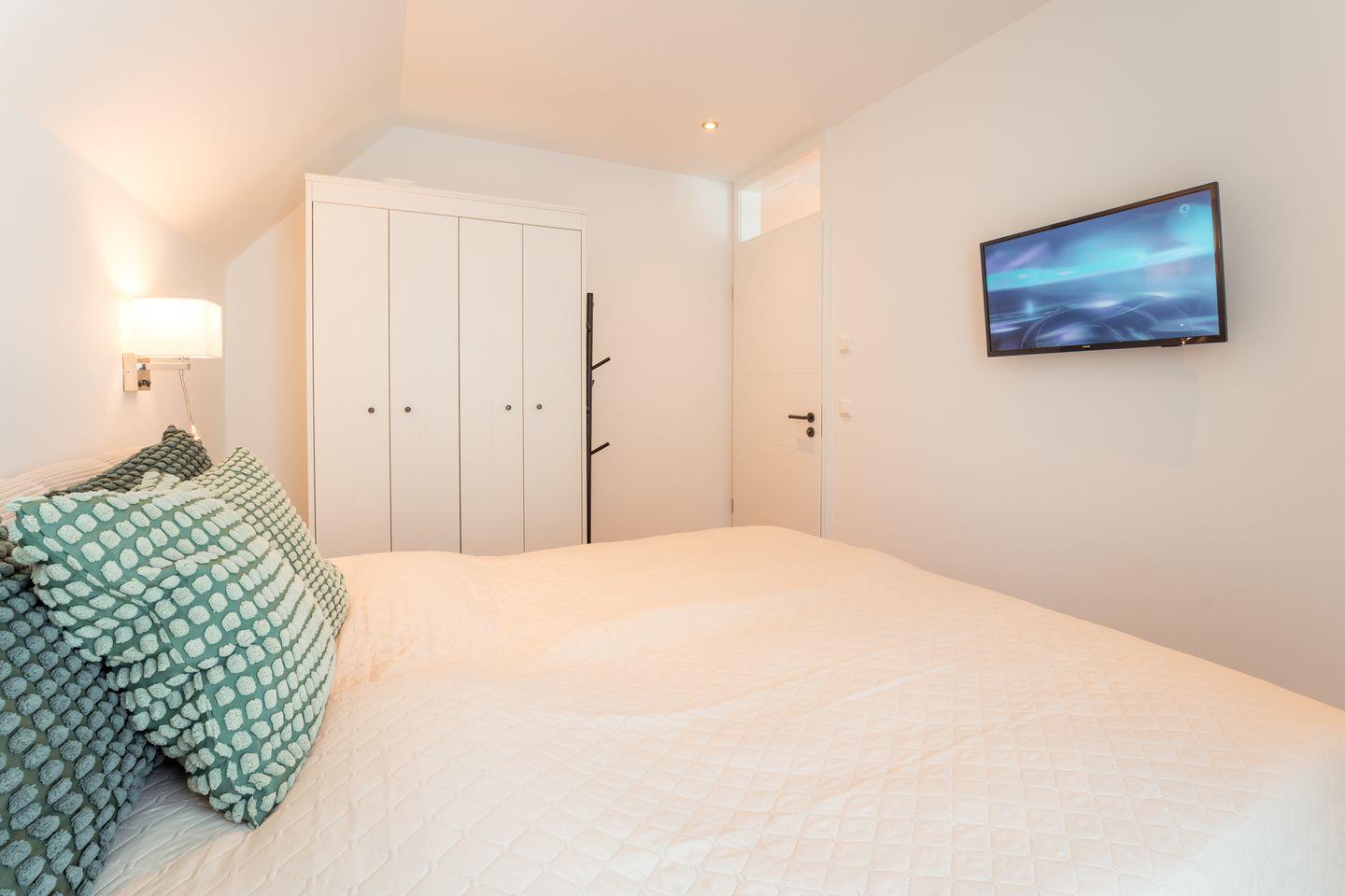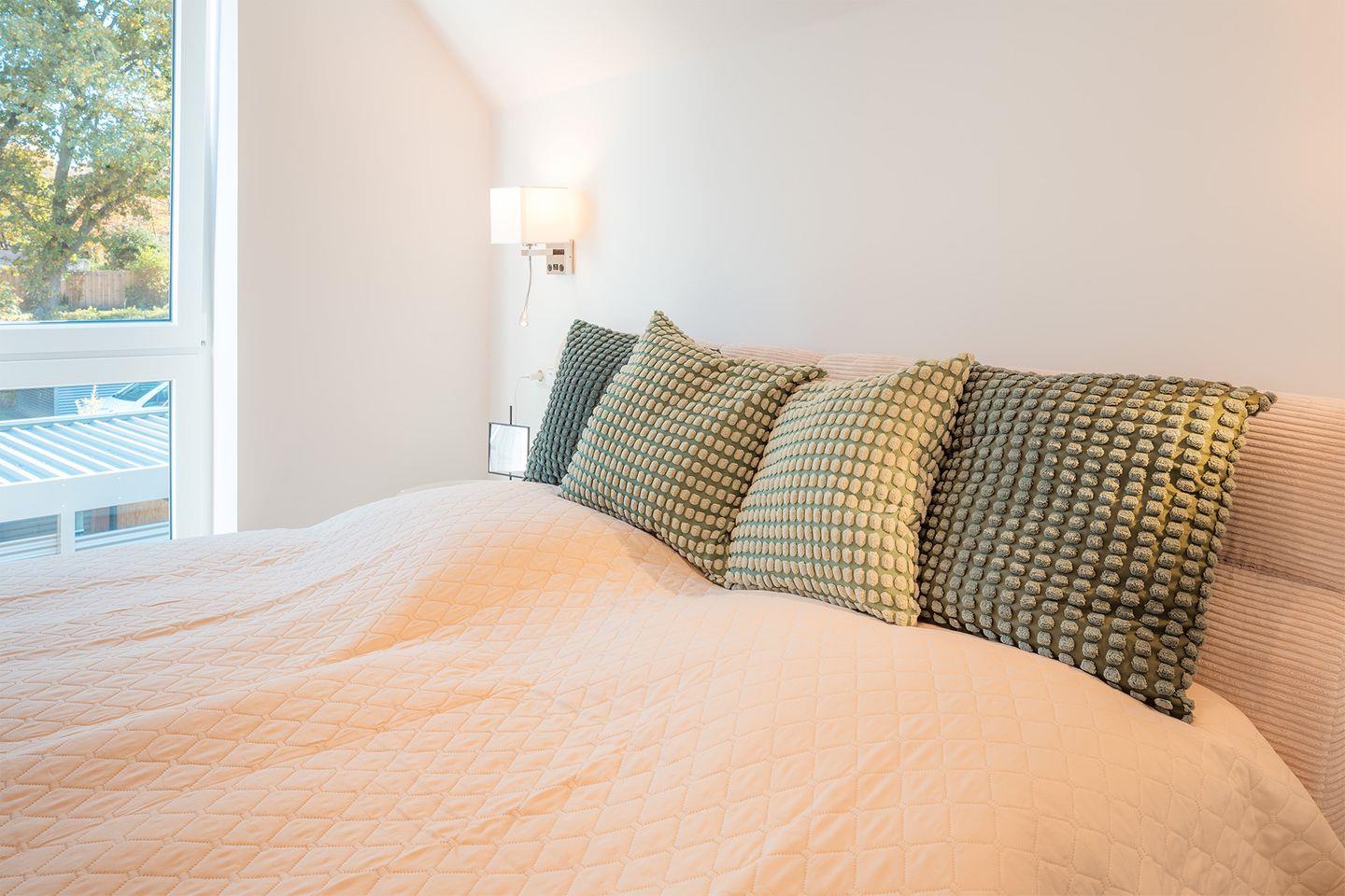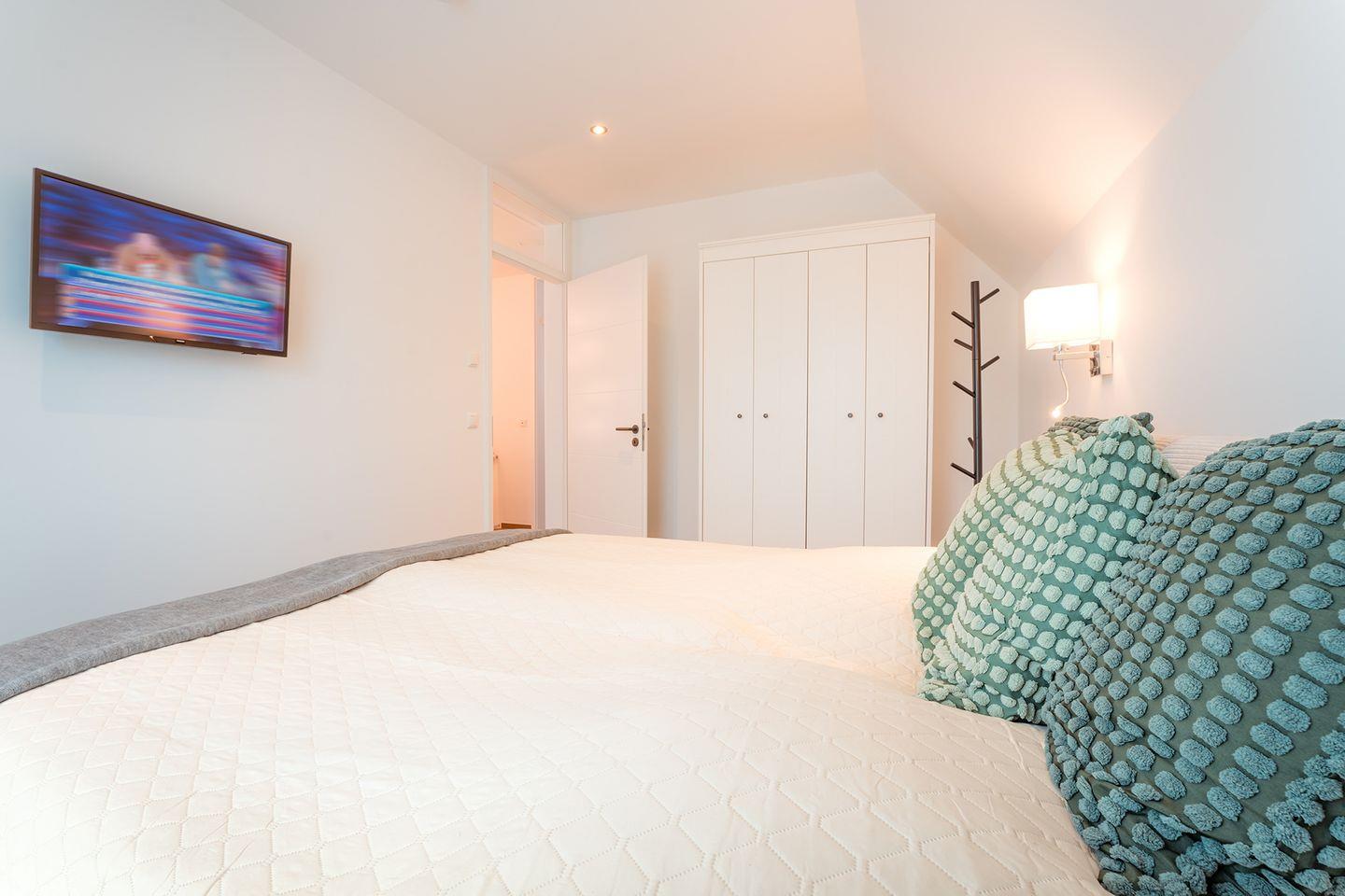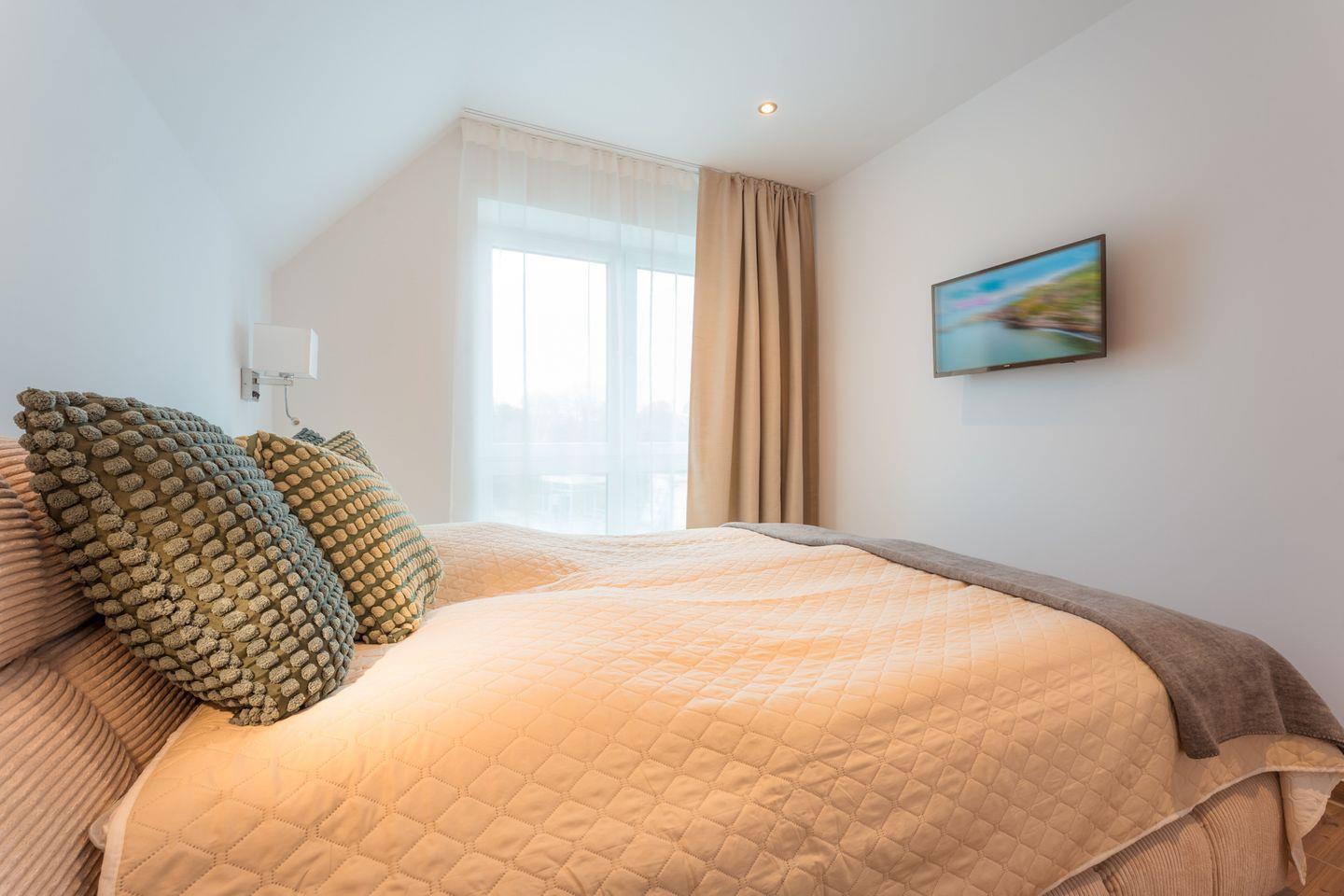 Schlafzimmer 2: Doppelbett (Maße: 180 x 200 cm- durchgängige Matratze), Nachttische, Leselampen, Kleiderschrank, Smart-TV, Sitzbank, Verdunklungsmöglichkeit durch Vorhang