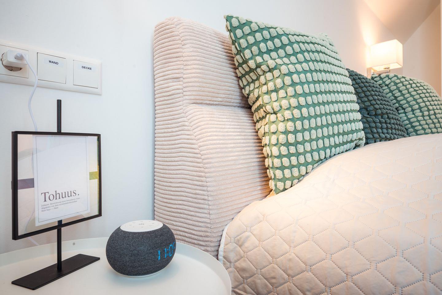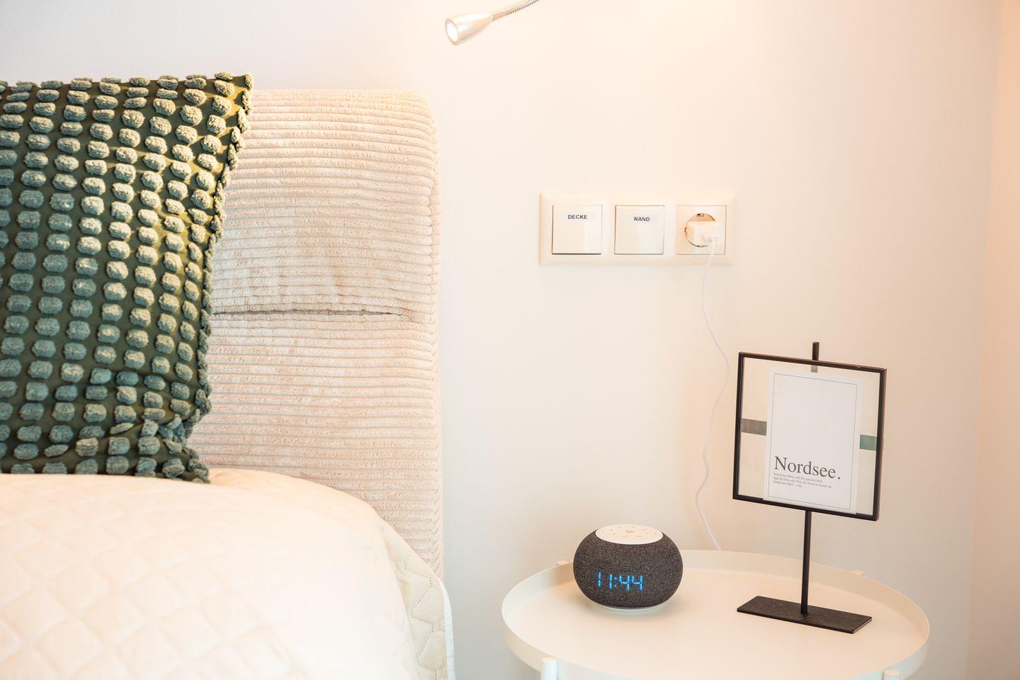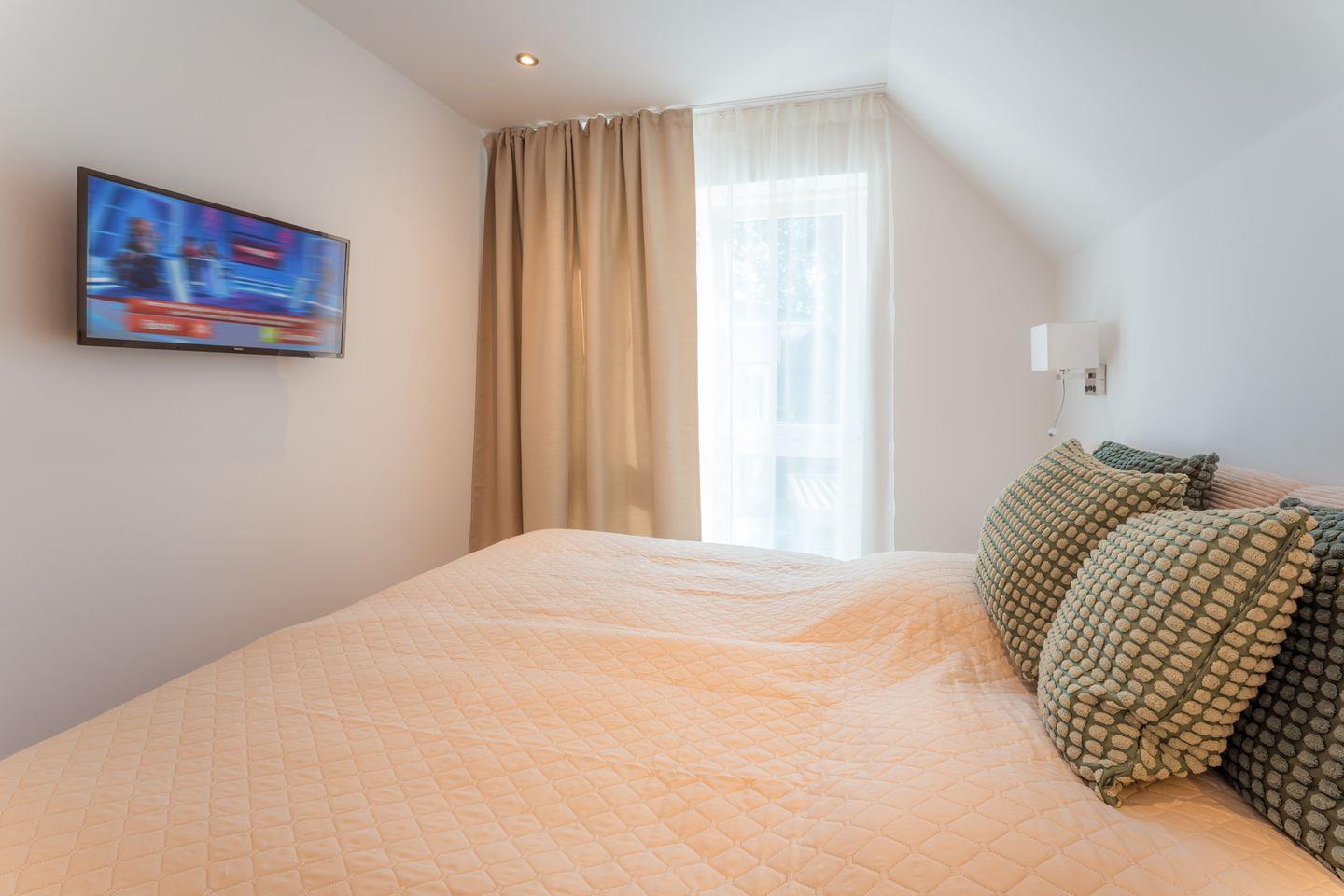 Schlafzimmer 1: Doppelbett (Maße: 180 x 200 cm- durchgängige Matratze), Nachttische, Leselampen, Kleiderschrank, Smart-TV, Verdunklungsmöglichkeit durch Vorhang