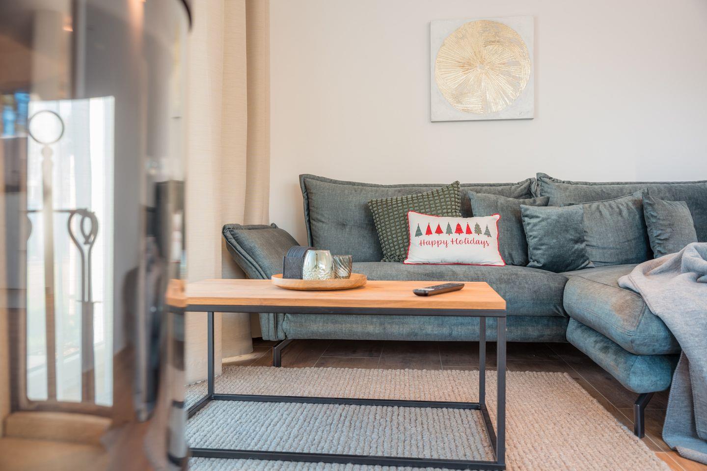 Wohn-Esszimmer: Sofalandschaft, Couchtisch, Leselampe, Flachbildfernseher (Smart-TV), Empfang deutschsprachiger TV-Programme (SAT-Anlage),Kamin, Spielküche