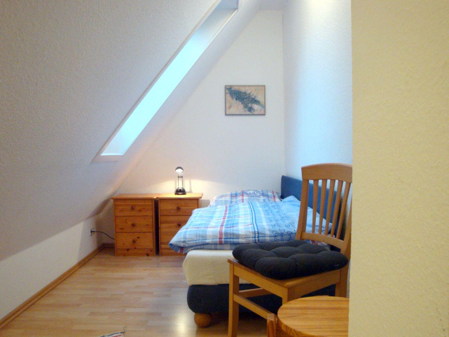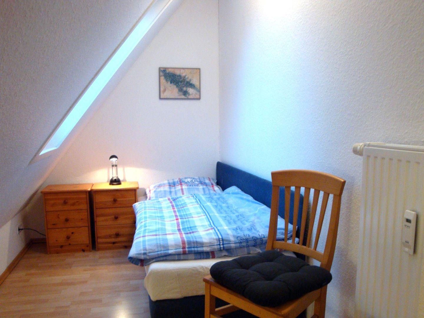 2. Schlafzimmer: Schlafzimmer mit Doppelbett (Maße: 180 x 200 cm) und einem Einzelbett (Maße: 90 x 200 cm), Kleiderschrank, Rolladen zur Verdunkelung