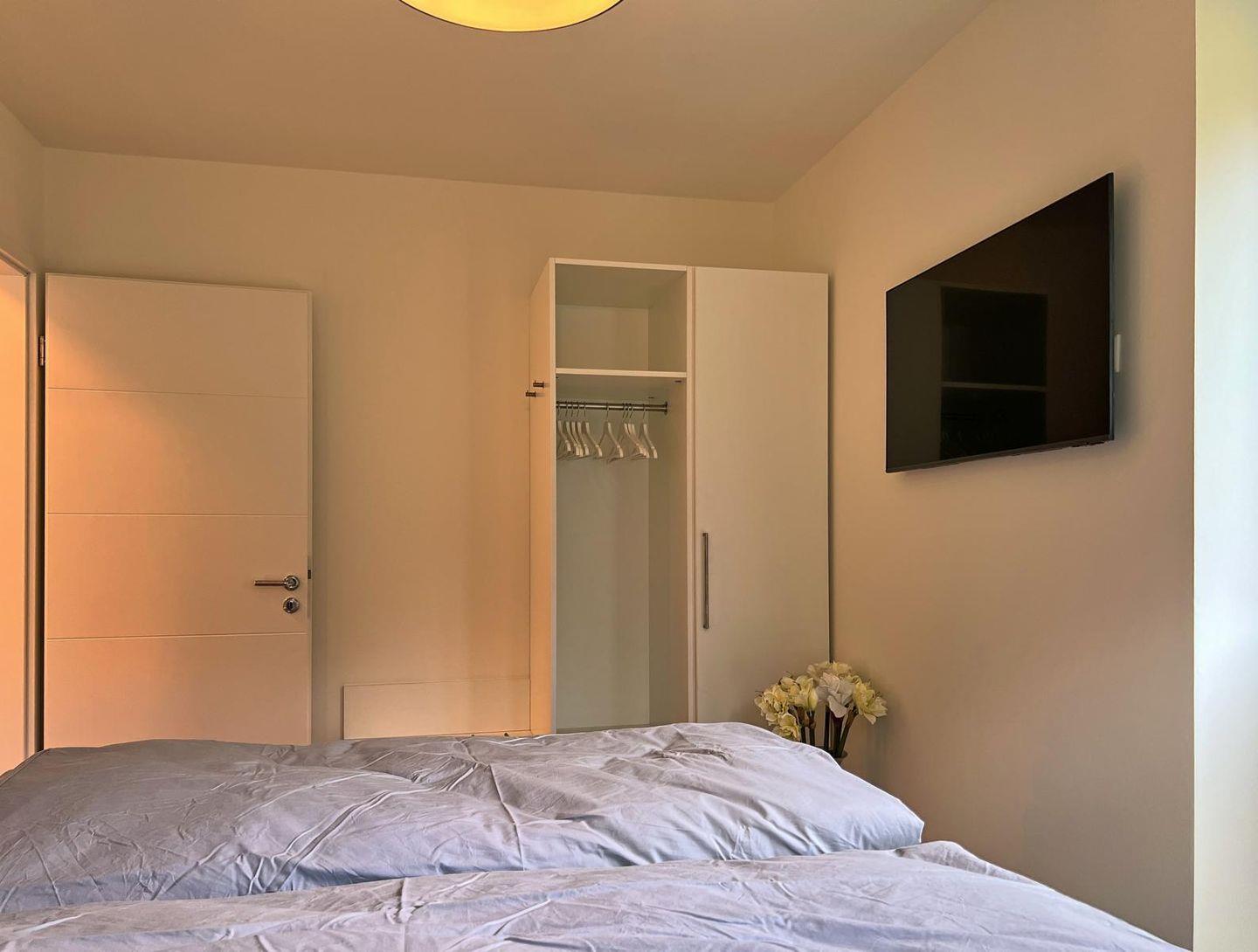 Schlafzimmer 2: Doppelbett (Maße: 180 x 200 cm), Nachttische, Leselampen, Kleiderschrank, Smart-TV, Plissees, verdunkelnde Vorhänge