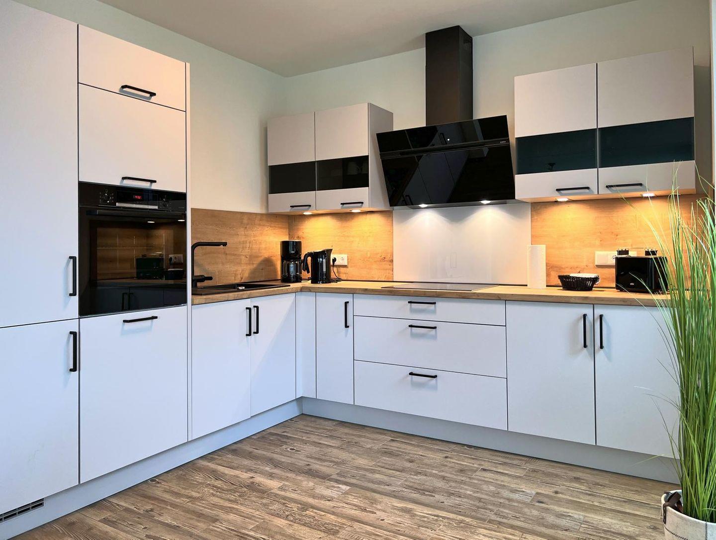 Küche und Haushalt: Einbauküche, Kühlschrank mit Gefrierfach, Induktionsherd, Dunstabzugshaube, Backofen, Geschirrspüler, Kaffeefiltermaschine, Toaster, Wasserkocher, hochwertiges Geschirr und Besteck, diverse Küchenutensilien