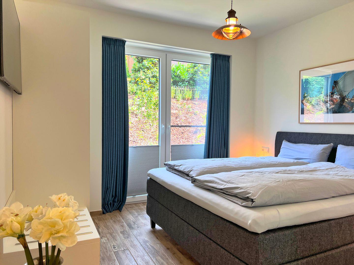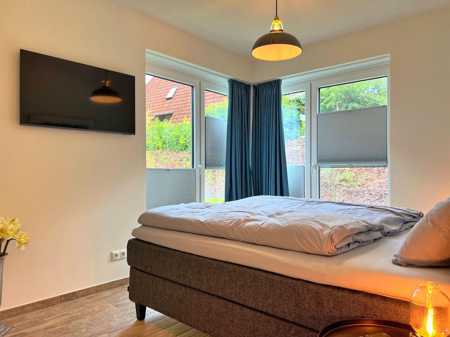 Schlafzimmer 1: Doppelbett (Maße: 180 x 200 cm), Nachttische, Leselampen, Kleiderschrank, Smart-TV, Plissees, verdunkelnde Vorhänge