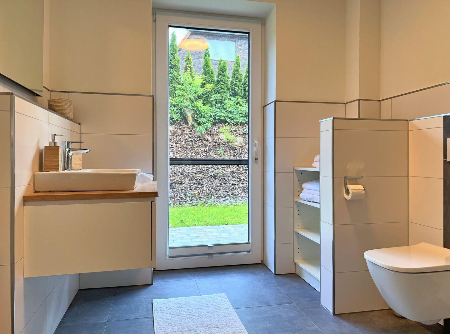 Duschbad : bodentiefe, barrierefreie Regendusche, Waschtischanlage mit Spiegel, Abstellflächen, WC, Haartrockner
