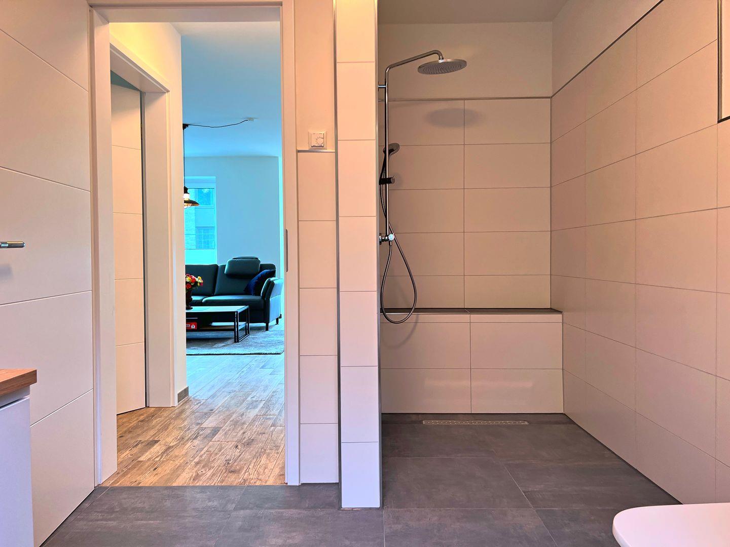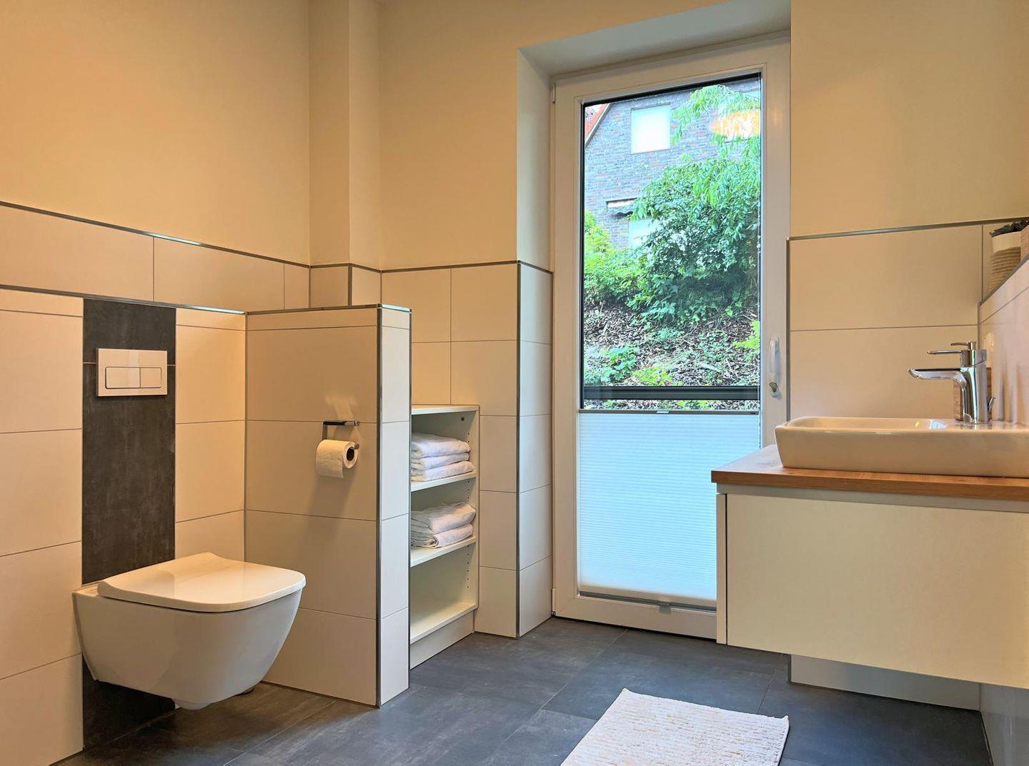 Duschbad : bodentiefe, barrierefreie Regendusche, Waschtischanlage mit Spiegel, Abstellflächen, WC, Haartrockner