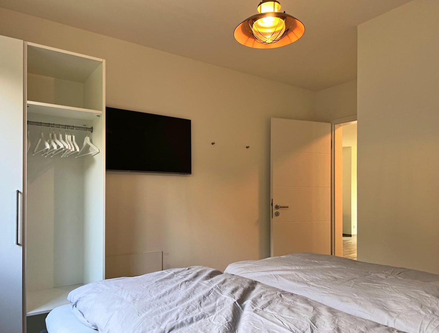 Schlafzimmer 2: Doppelbett (Maße: 180 x 200 cm), Nachttische, Leselampen, Kleiderschrank, Smart-TV, Plissees, verdunkelnde Vorhänge