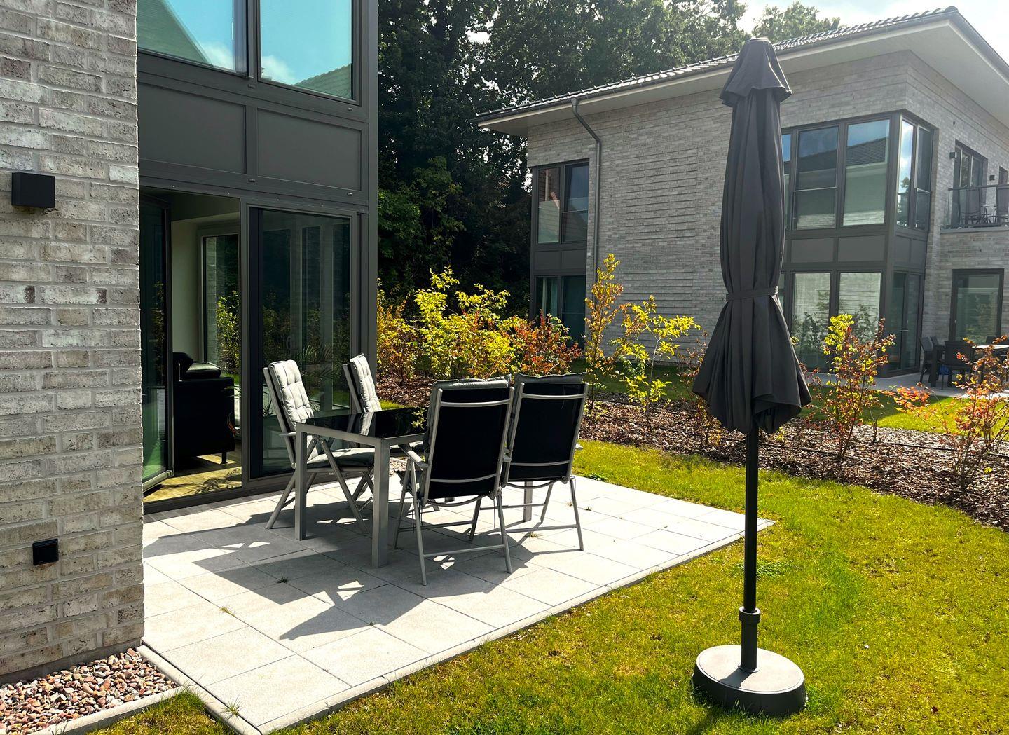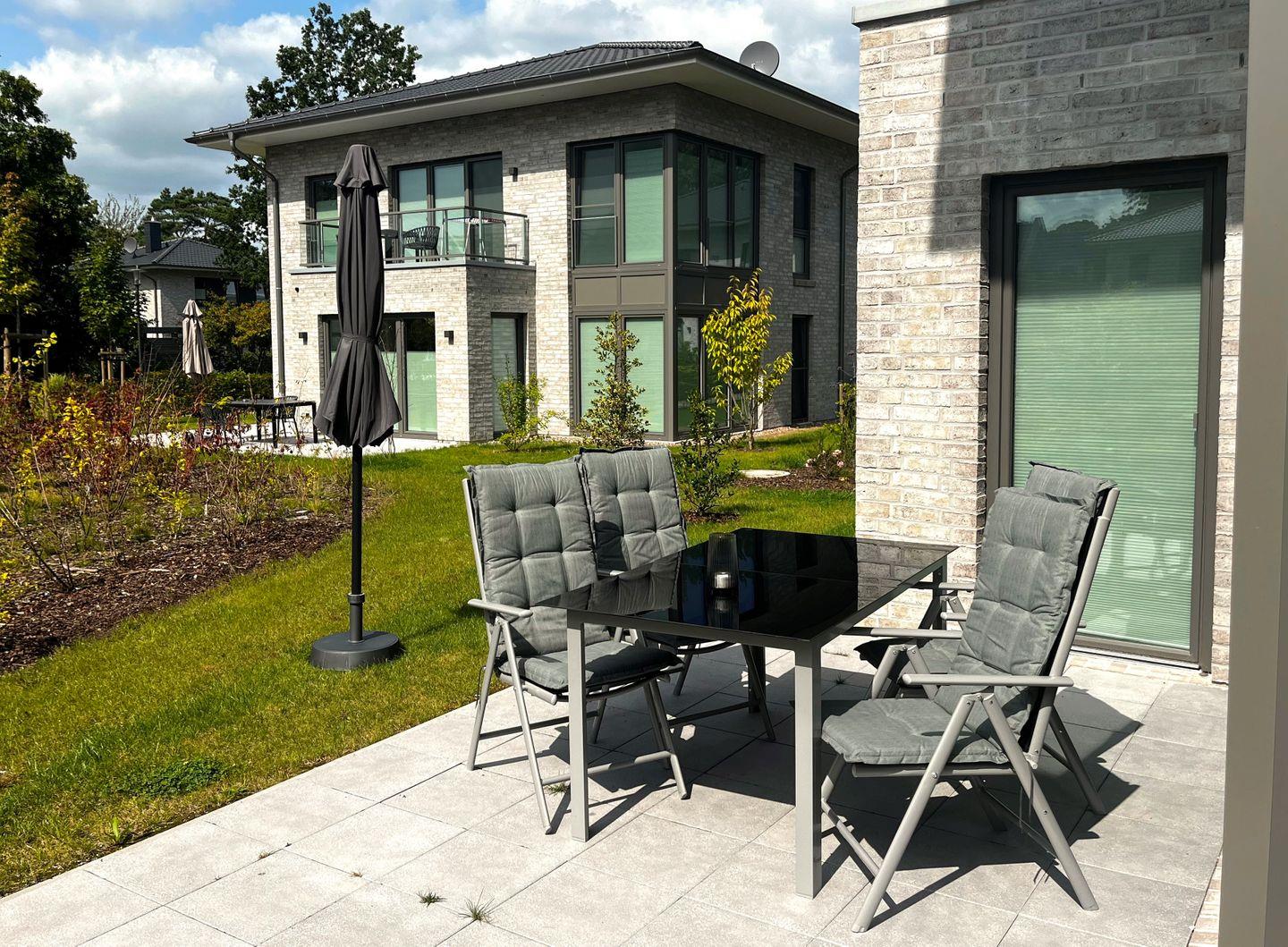 Ausstattung Außen: Gartenmöbel, abschließbarer Fahrradschuppen mit der Lademöglichkeit für E-Bikes