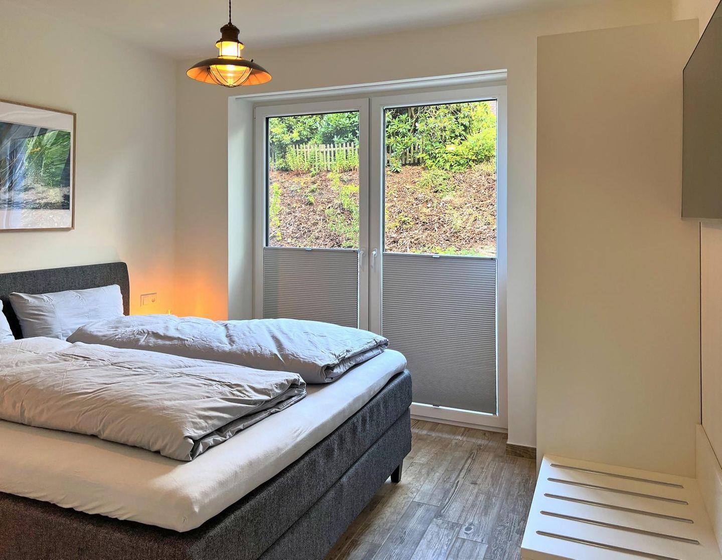 Schlafzimmer 1: Doppelbett (Maße: 180 x 200 cm), Nachttische, Leselampen, Kleiderschrank, Smart-TV, Plissees, verdunkelnde Vorhänge