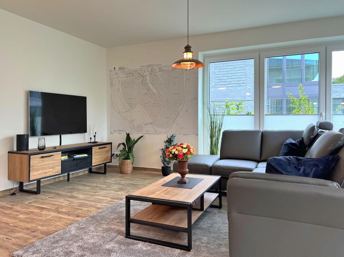 Wohn-Esszimmer: Sofalandschaft, Couchtisch, Flachbildfernseher (Smart-TV), Empfang deutschsprachiger TV-Programme (SAT-Anlage)
