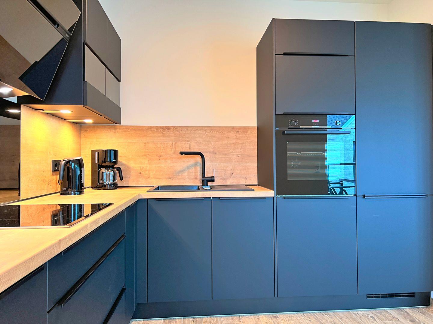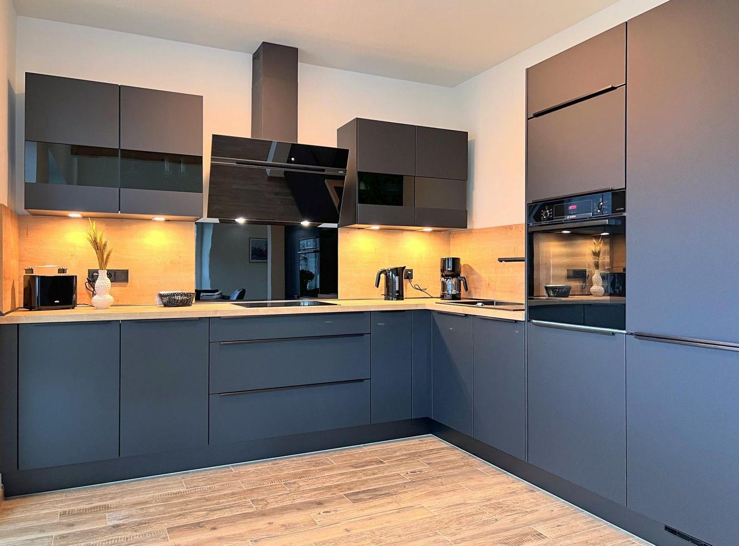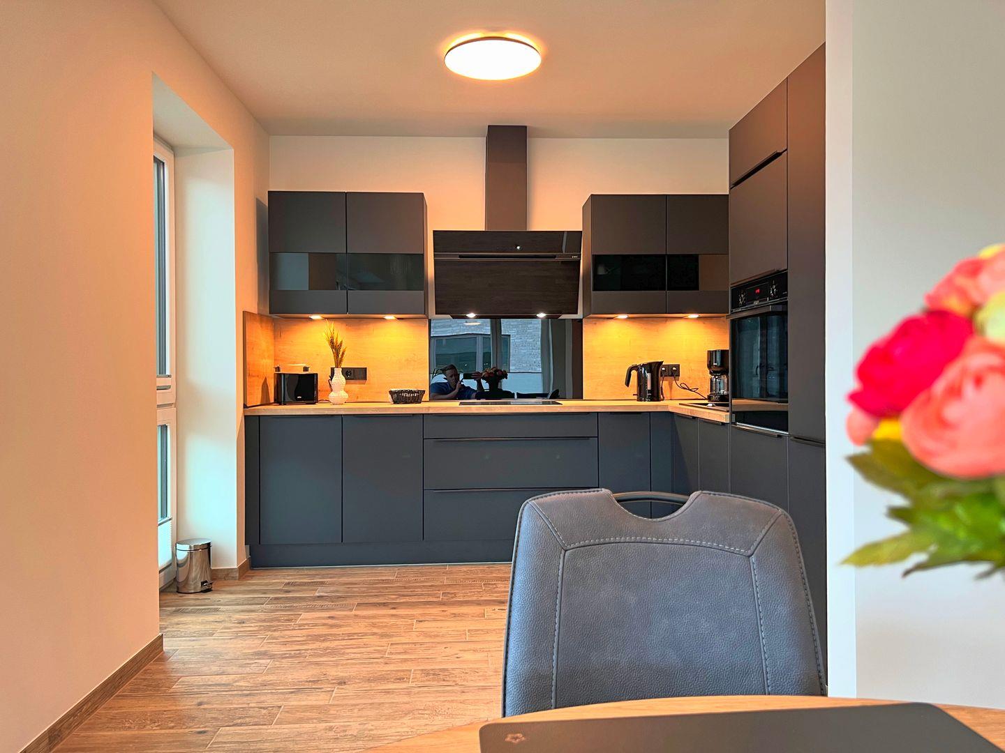 Küche und Haushalt: Einbauküche, Kühlschrank mit Gefrierfach, Induktionsherd, Dunstabzugshaube, Backofen, Geschirrspüler, Kaffeefiltermaschine, Toaster, Wasserkocher, hochwertiges Geschirr und Besteck, diverse Küchenutensilien
