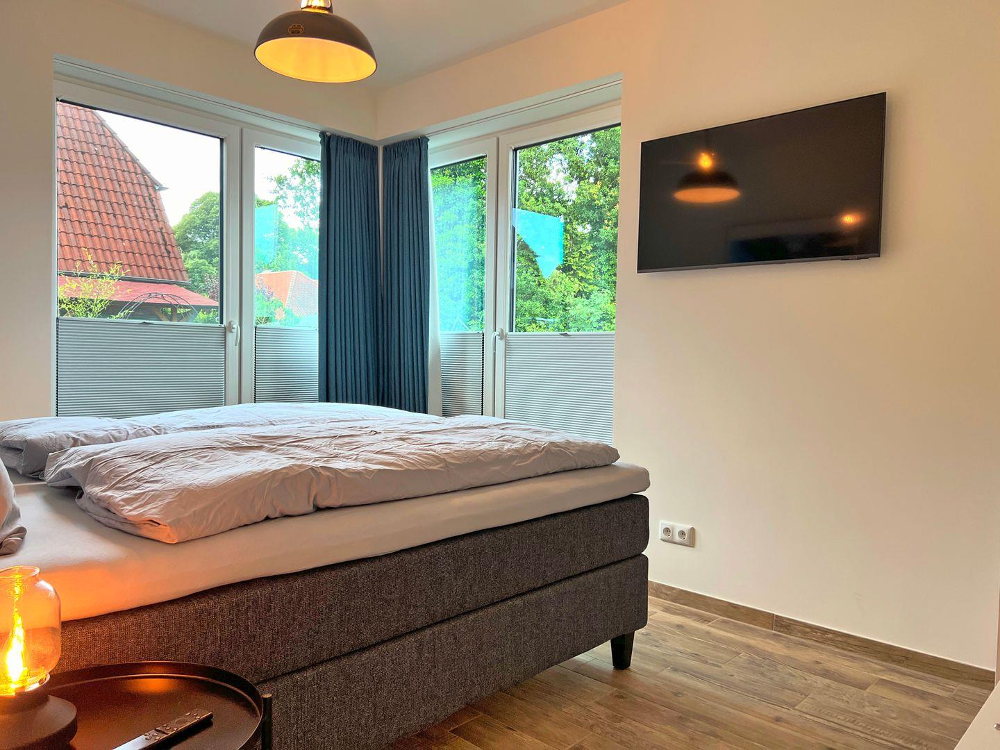 Schlafzimmer 1: Doppelbett (Maße: 180 x 200 cm), Nachttische, Leselampen, Kleiderschrank, Smart-TV, Plissees, verdunkelnde Vorhänge