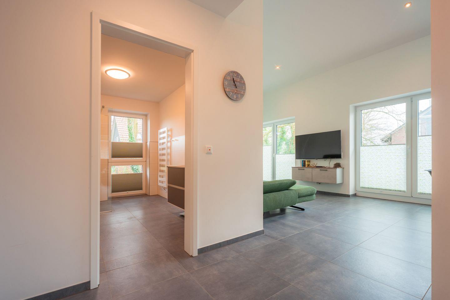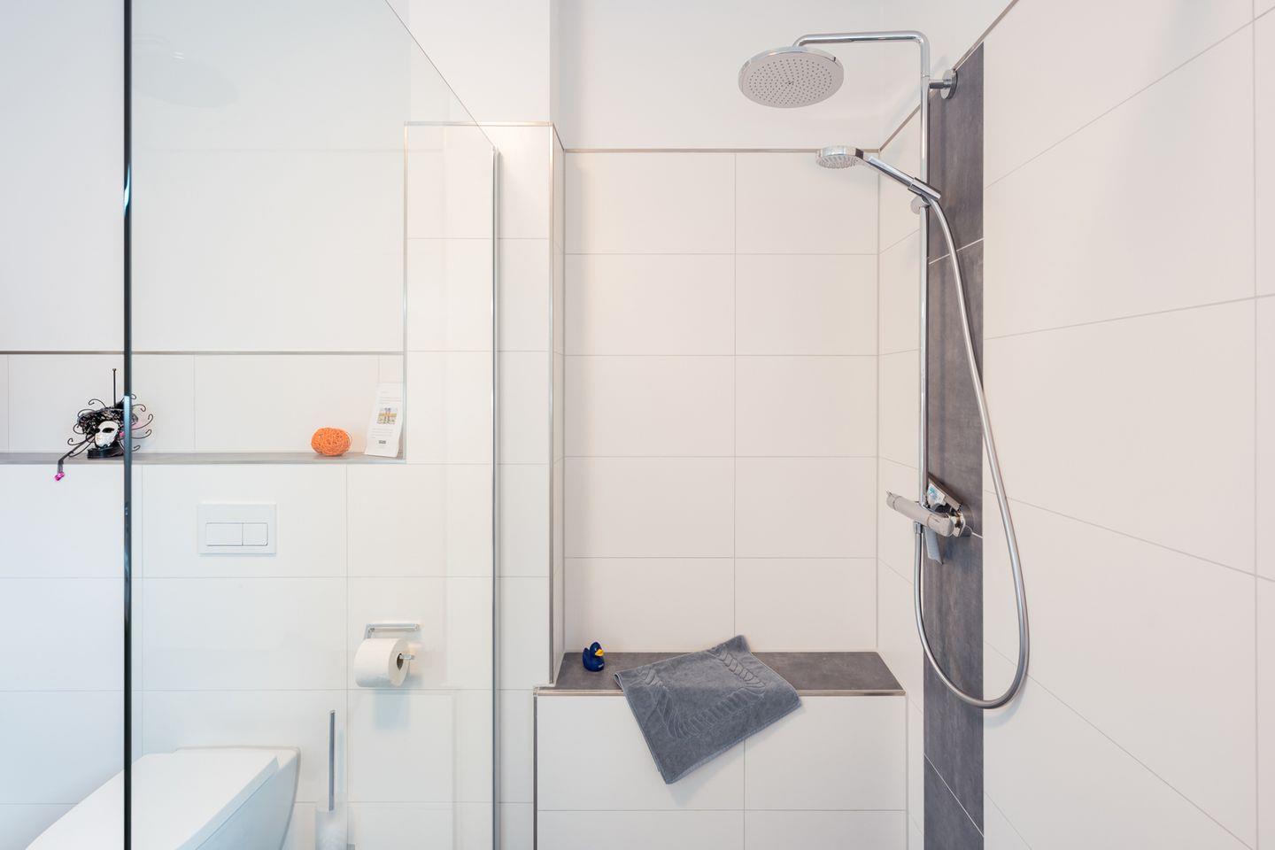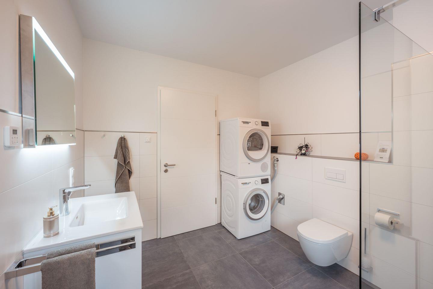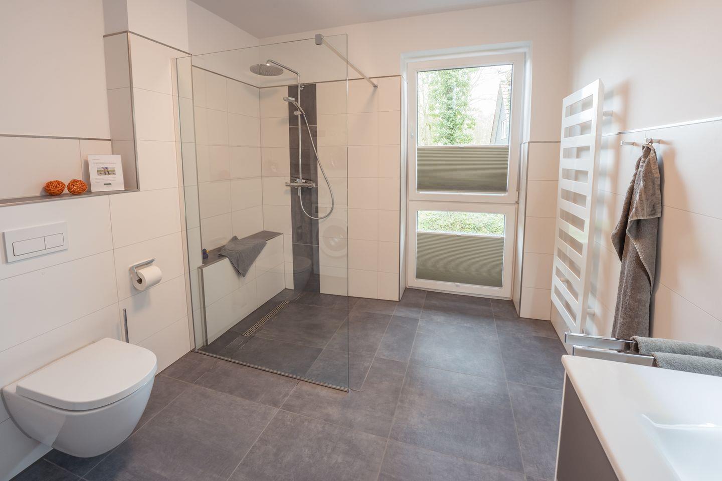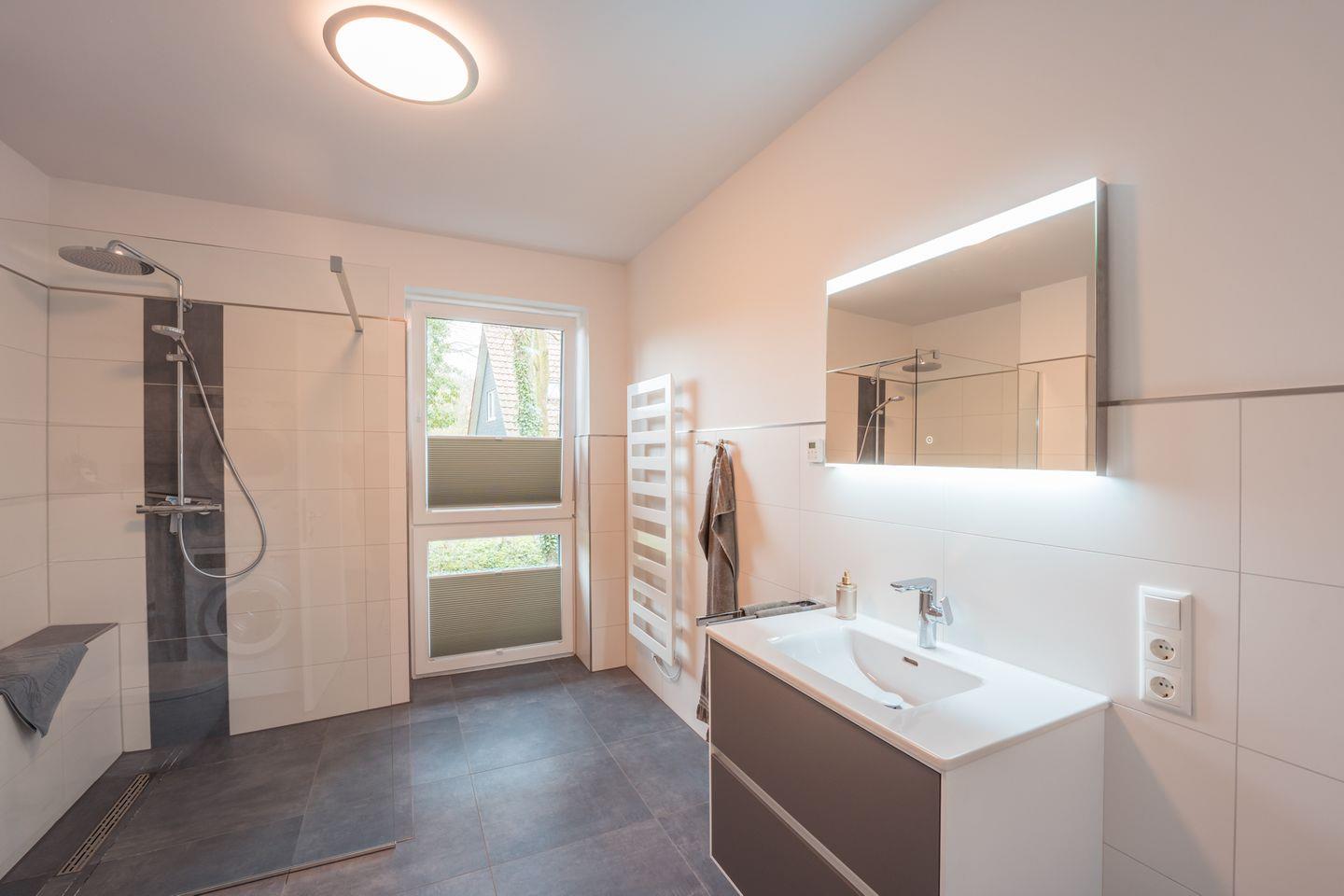 Tageslichtbad: bodentiefe, barrierefreie Sommerregendusche, Waschtischanlage mit Spiegel, Föhn, WC, Handtuchheizung, Waschmaschine, Trockner, Verdunklungs-Plissees, Handtücher auf Anfrage